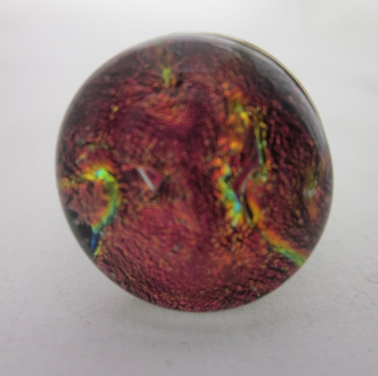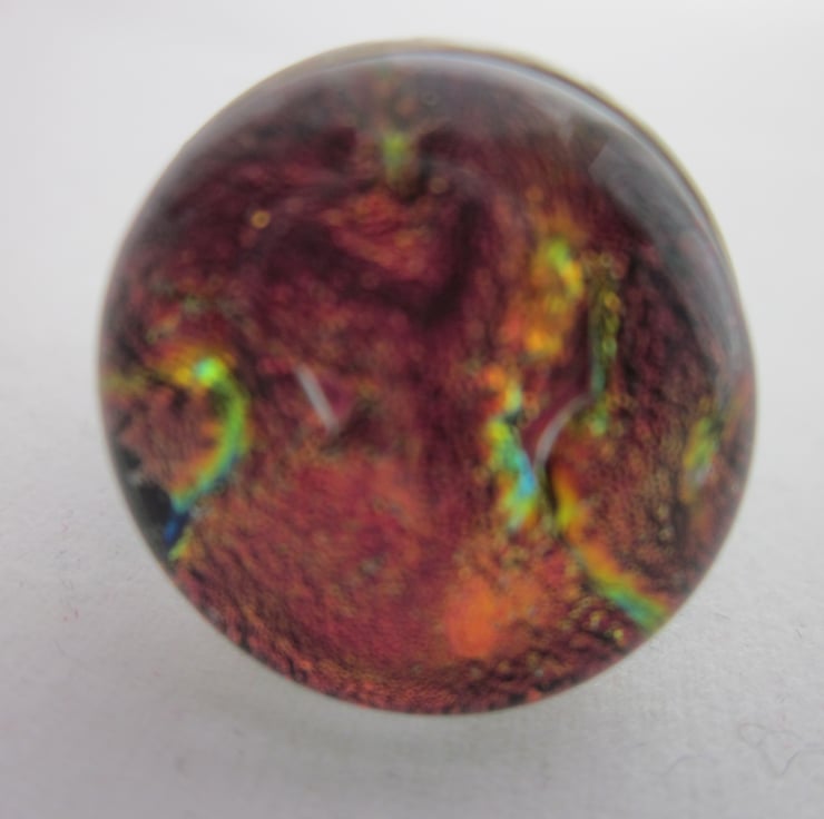 This glass cabochon was fused by me. The glass was heated up to around 800 degrees celsius in a small glass fusing kiln and then it was then brought to annealing temperature to make it strong. When cooled, the cabochon was shaped using a glass grinder and the edges were smoothed. It was then fire polished in the kiln to create a glossy surface. This whole process takes over 17 hours to complete.