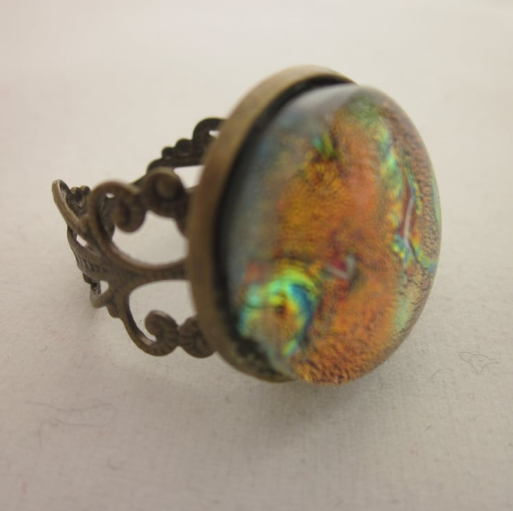 This cabochon is a wonderful flame-like dichroic with flashes of turquoise and yellow-green, the colour changes at different angles, deepening straight on as the photos show. It is fitted with a bronze coloured metal adult sized adjustable filigree cabochon ring. It is approximately 2cm diameter.
