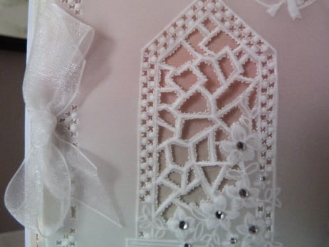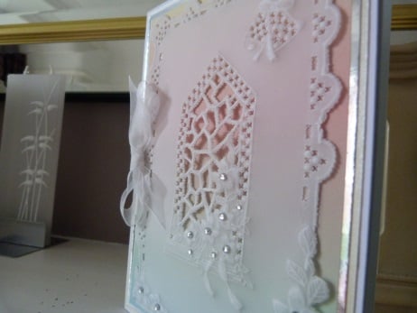 This is a completely handmade and unique card. Consisting of parchment which has been embossed cut and pierced with a church stained glass window. This has been mounted onto rainbow shaded vellum, then onto silver mirri, then onto gold pearl card and then onto quality pristine white card. Embellished with silver rhinestones and white organza bow.