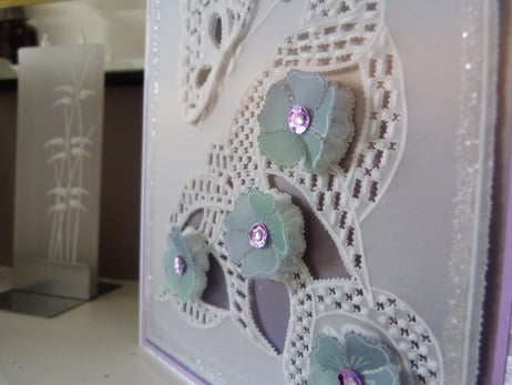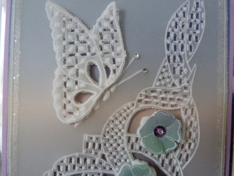 A completely handmade and unique designed card. Consisting of parchment which has been embossed, cut and pierced into an intricate design, with double layered flowers and butterfly. Mounted onto blue shaded vellum, then lilac pearl card, then silver mirri then quality pristine white card. Embellished with rhinestones, sequins and fine glitter bordering the parchment.