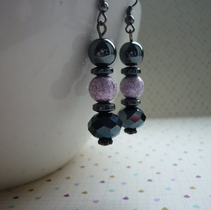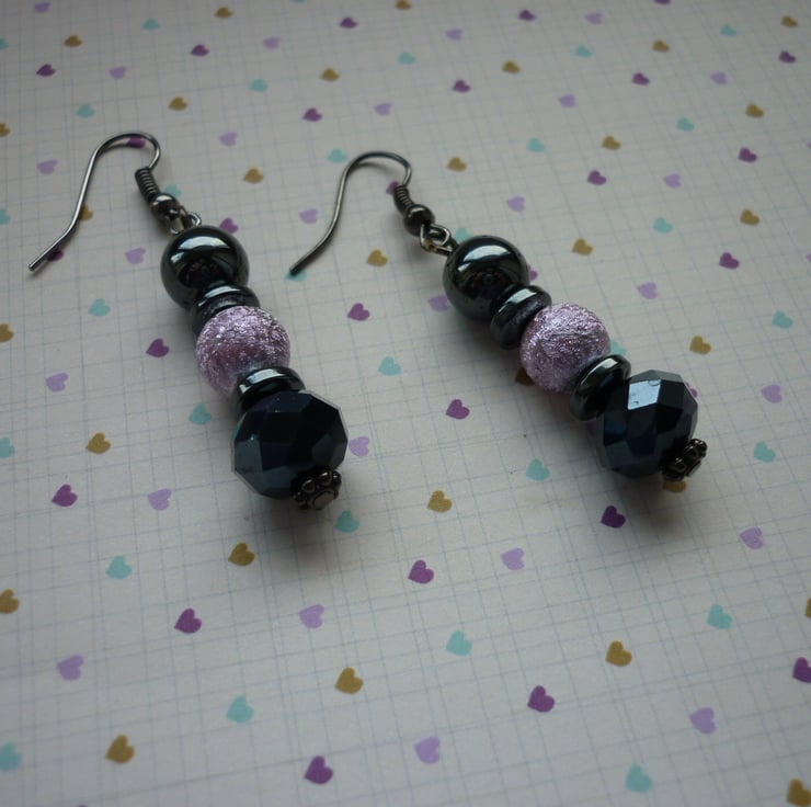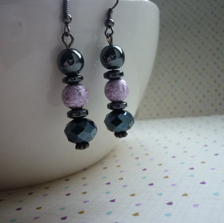 THE EARRINGS HAVE BEEN MADE WITH FACETED RONDELLE SHAPED HEMATITE STONE BEADS, ROUND HEMATITE STONES, ROUND GLASS BEADS IN MOTTLED PINK AND SILVER, HEMATITE COLOURED SPACER BEADS AND FINISHED WITH BLACK FISH HOOK EAR WIRES.