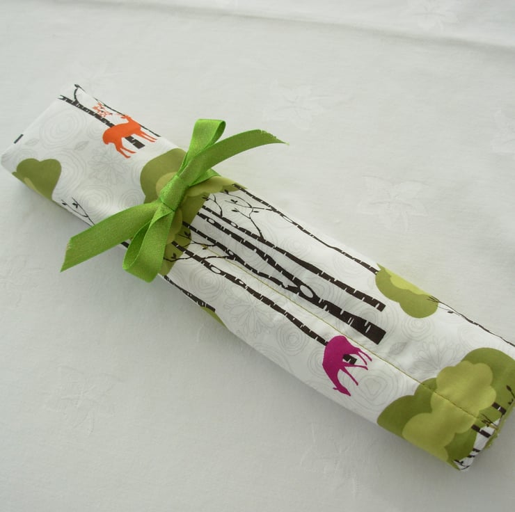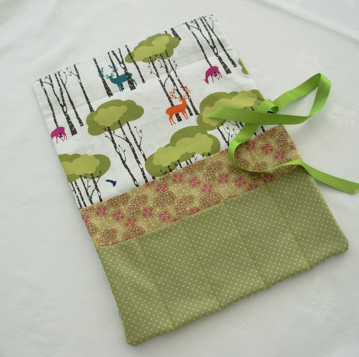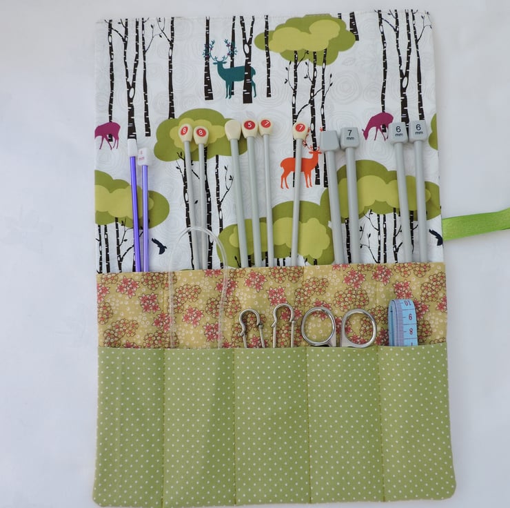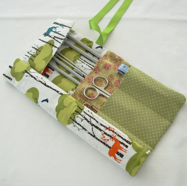 I've made this knitting needle roll with a cotton fabric for the outer and inner depicting trees and deer.. The double layer of pockets with five divisions in each layer are made from coordinating sage green, white and pink fabrics. The divisions are large enough to hold a number of needles, crochet hooks, scissors, tape measures etc.
