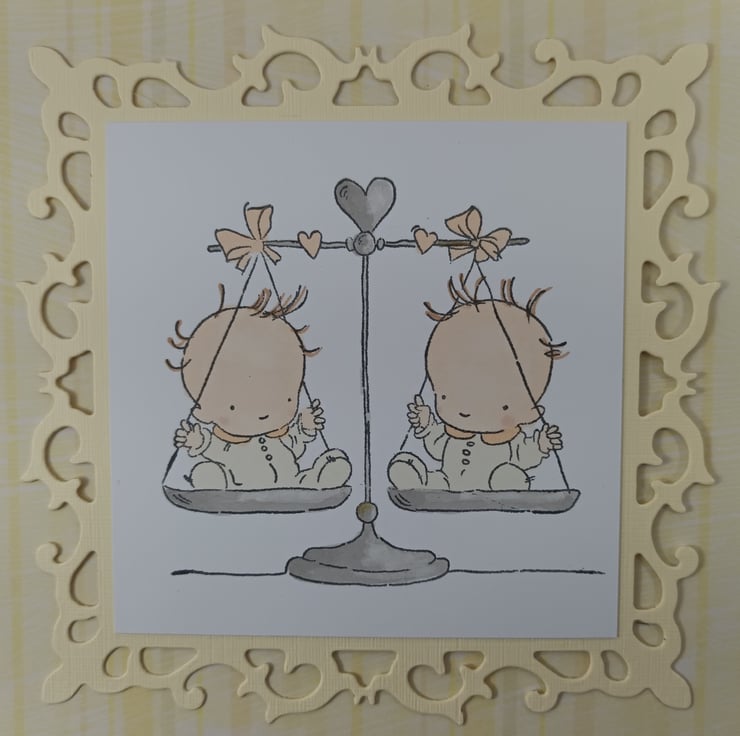 Square, neutral, new baby card featuring a hand stamped and coloured image of twin babies sitting in a set of scales.