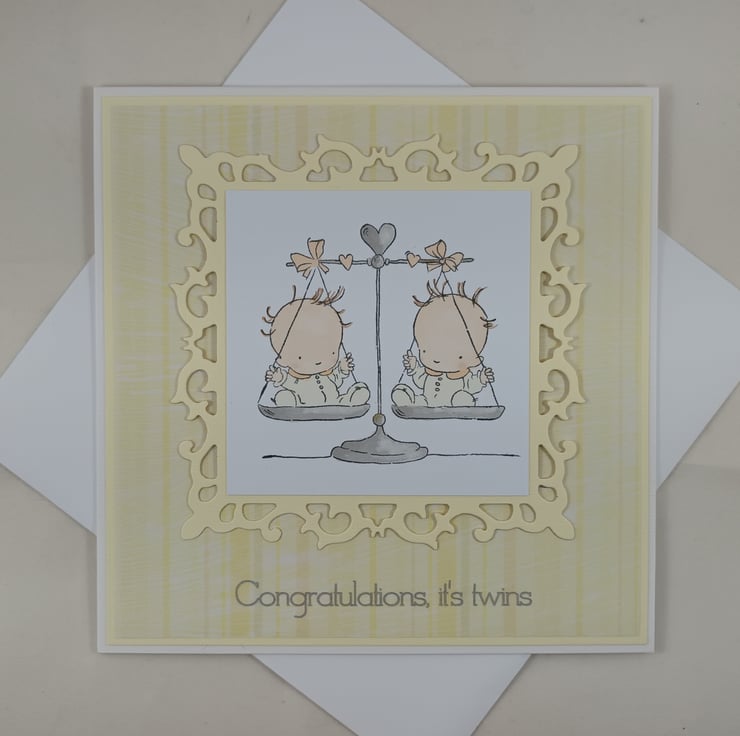 The image has been framed in die cut cream card and then layered onto a background of cream and lemon striped paper on matching cream card. The sentiment reads 'Congratulations, it's twins'.