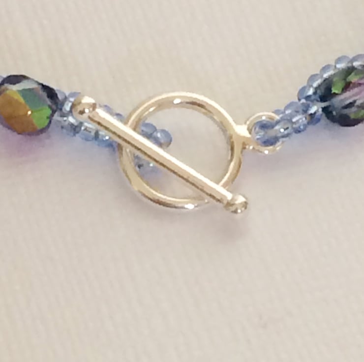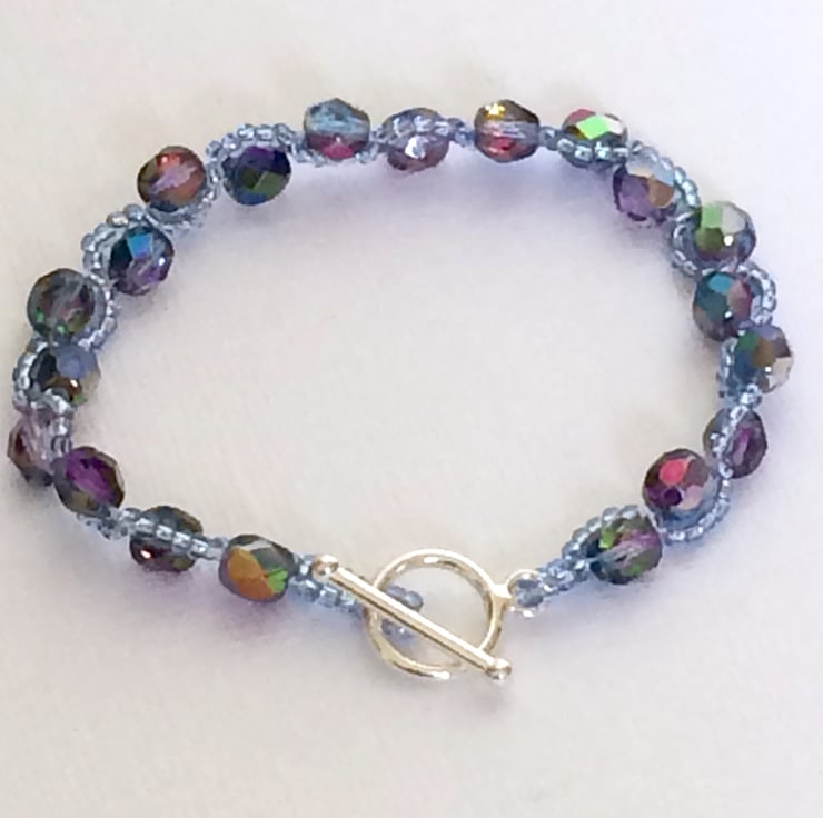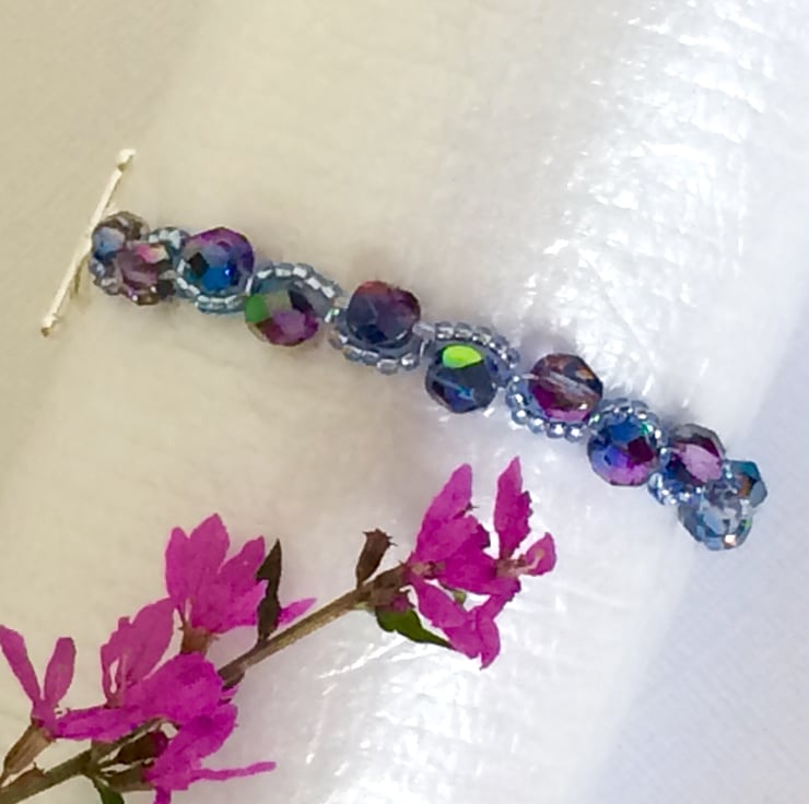I have created this sparkly bracelet with Czech Magic Blue Crystals and silver lined ice blue seed beads. The colour combination make a very pretty delicate looking bracelet full of rainbow colours. The bracelet is finished with a Sterling silver toggle clasp.