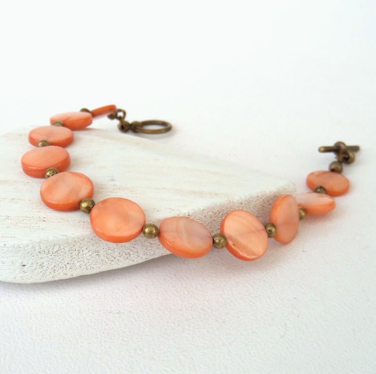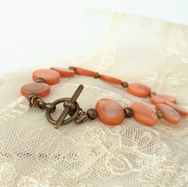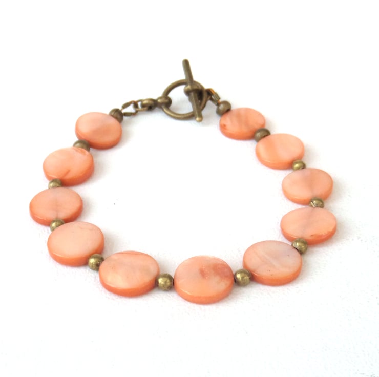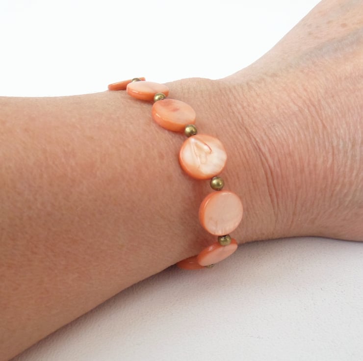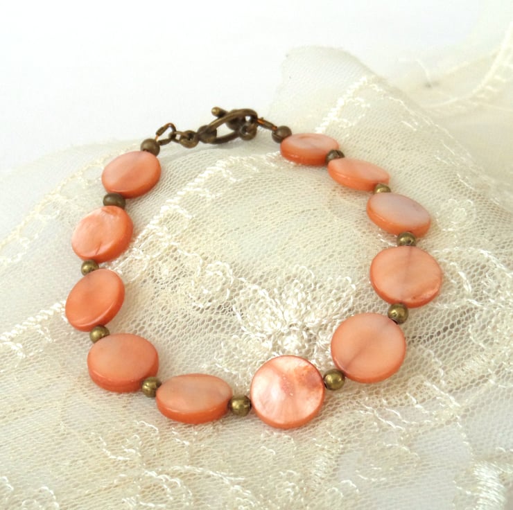 A lovely vibrant peach shell bracelet, made with individual shell coins separated by small bronze beads.