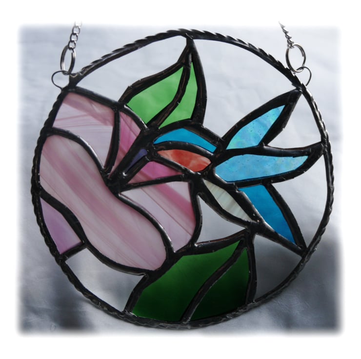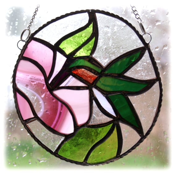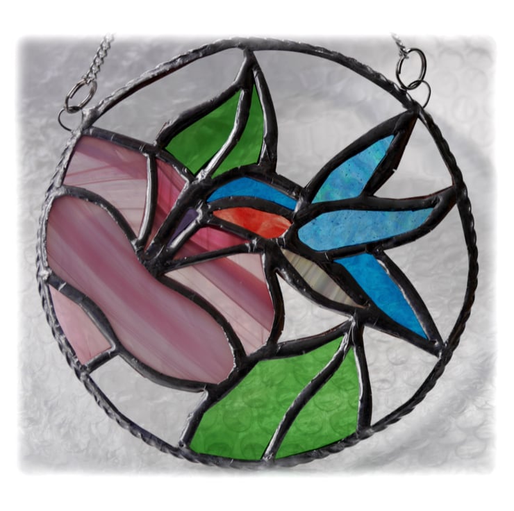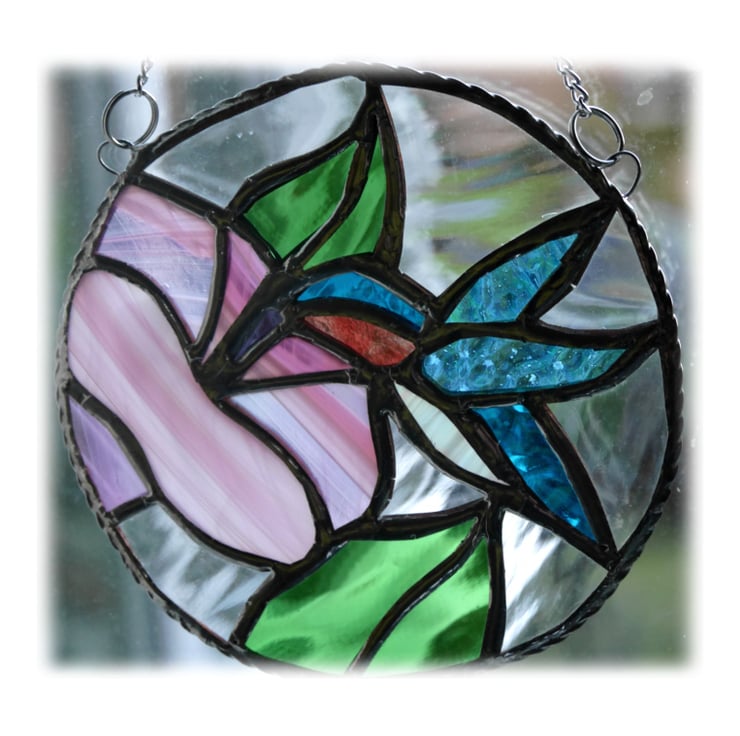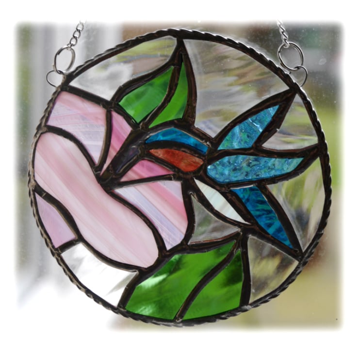 I love this hummingbird design. It looks absolutely stunning hanging up in the light where it shines and the different textures and shades of glass give it life and sparkle.
