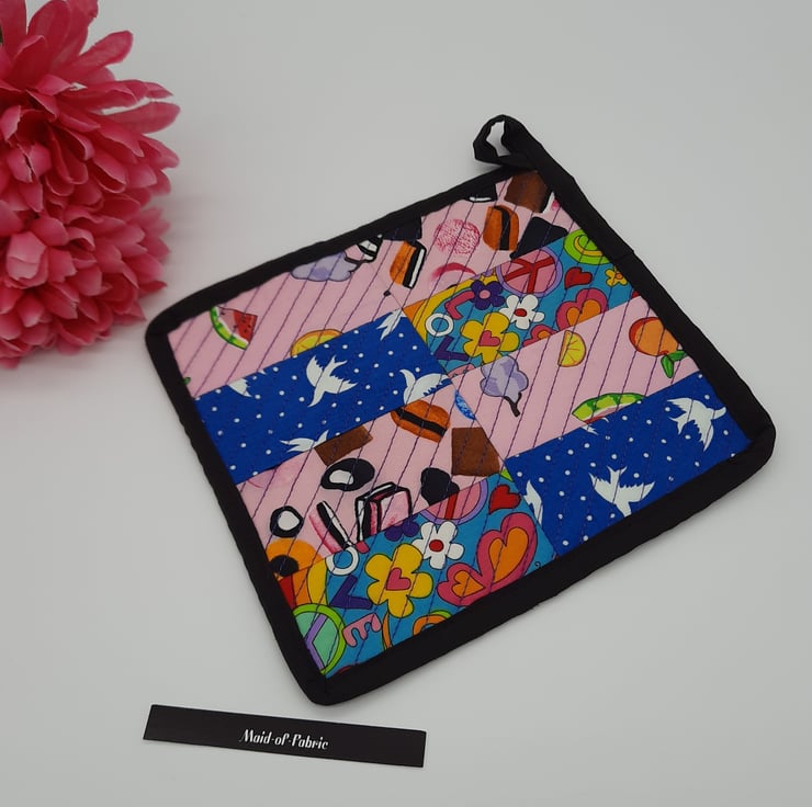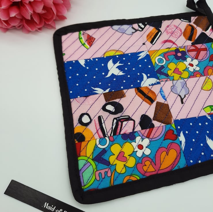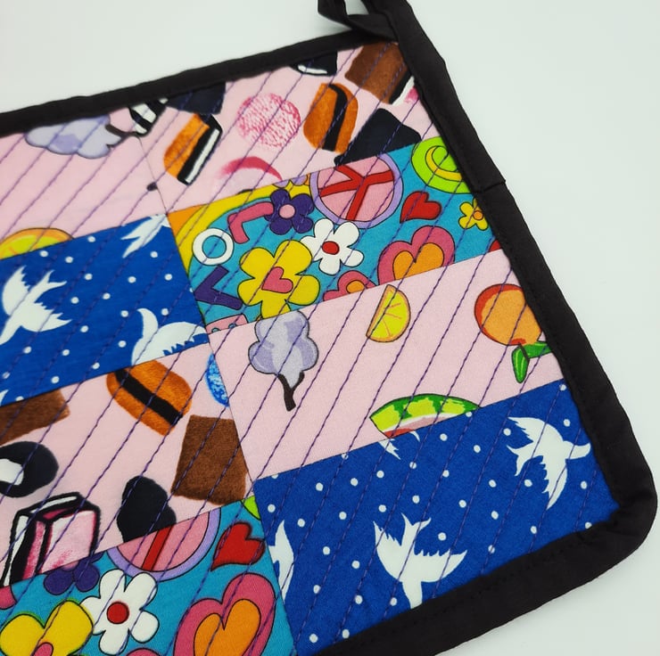 Made using 4 bright coloured fabrics. All sorts - blue birds - fruit salad - love peace.