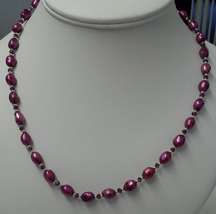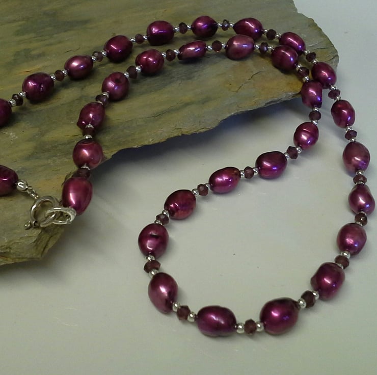This sweet delicate plum coloured barogue pearl necklace can be worn every day throughout the year by those who love wearing pearls with the added luxury of genuine quality faceted rhodolite garnets. It will be ideal for an older teenager's 18th birthday gift or for ladies who wear genuine gemstone jewellery to accessorise their wardrobe with on a daily basis.