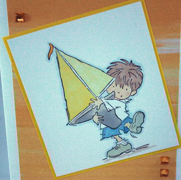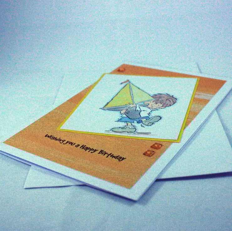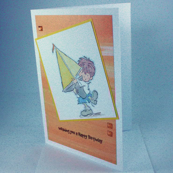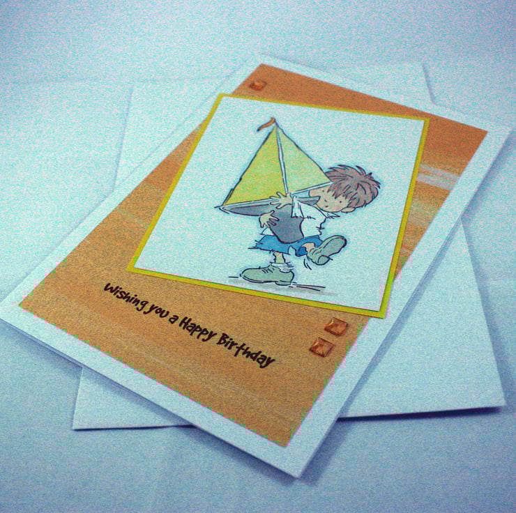 Child's birthday card featuring a hand stamped and coloured image of a boy with a sailing boat. This has been layered onto a yellow/orange background paper, with three small square gems. The message 'Wishing you a Happy Birthday' has been printed directly onto the background.