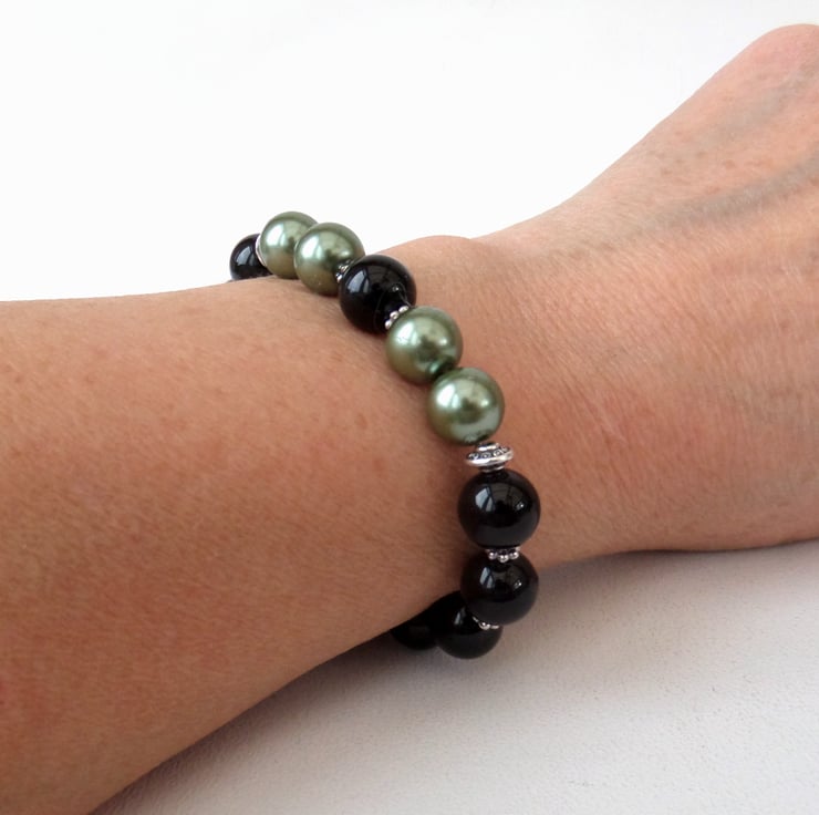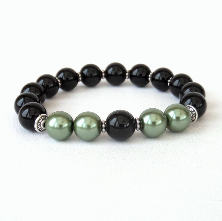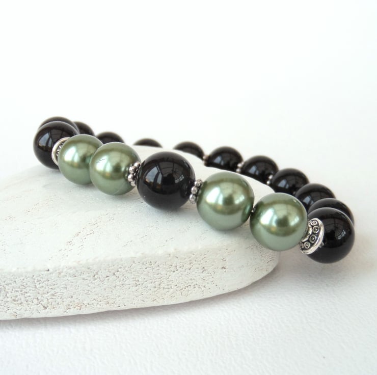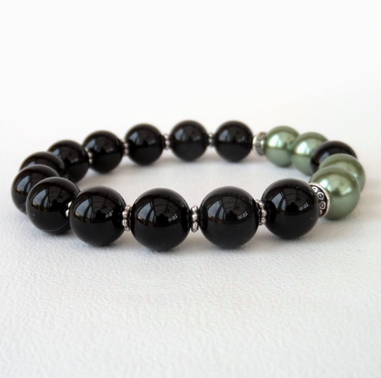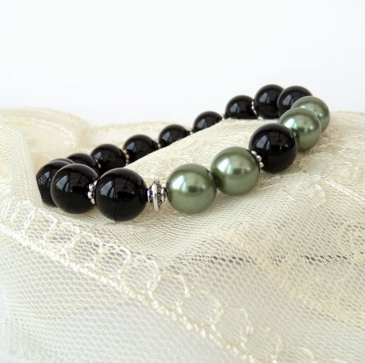 Stunning black onyx combines with sage green shell pearl in the creation of this bracelet.
