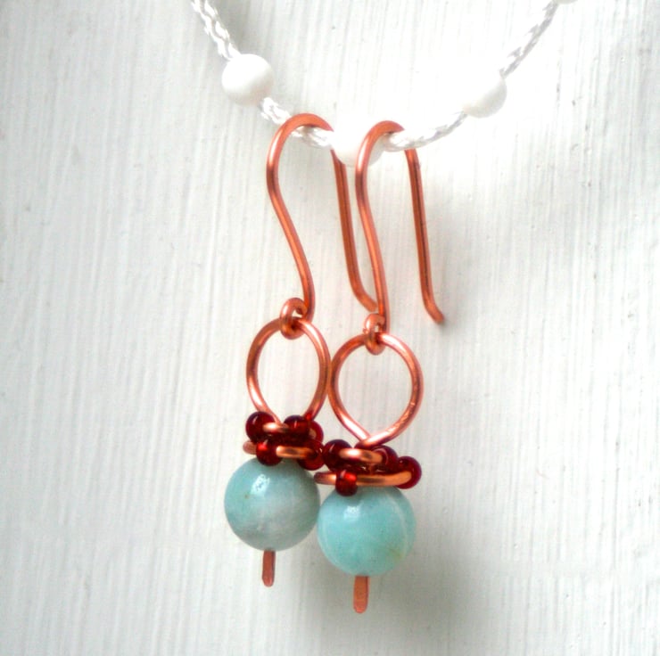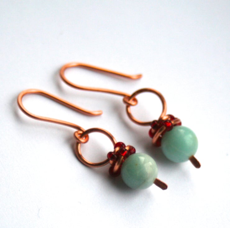 Turquoise coloured glass beads hang from a hand formed copper hoop and is wrapped with copper wire and red seed beads. The earwires are also handmade. All wire is non-tarnish copper.