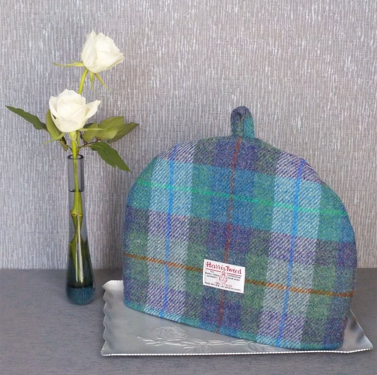 Handmade green and purple tartan Harris tweed tea cosy. I have made this beautiful quality cosy from the world renowned Harris Tweed handwoven fabric in a lovely green and purple check. It is lined in white cotton fabric, and wadded with polyester to keep your tea warm. The Orb label, your guarantee of authentic Harris Tweed fabric is proudly displayed.