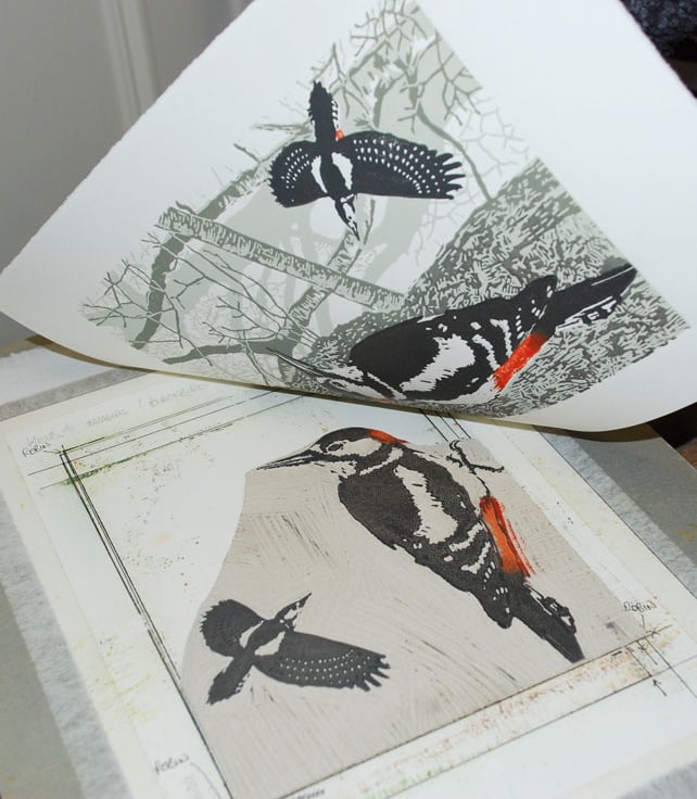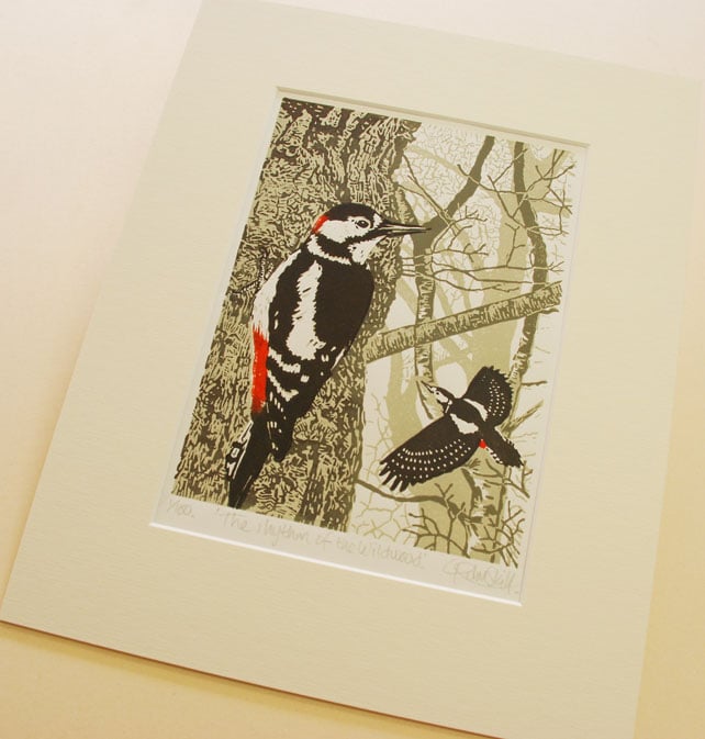 Great Spotted Woodpeckers original limited edition linocut print.
