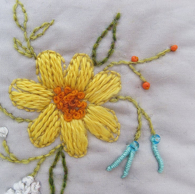 The embroidery is inspired by the patterns on mid century everyday household ceramics. In particular spring flowers.