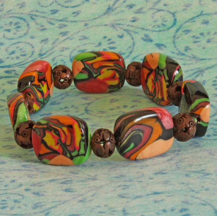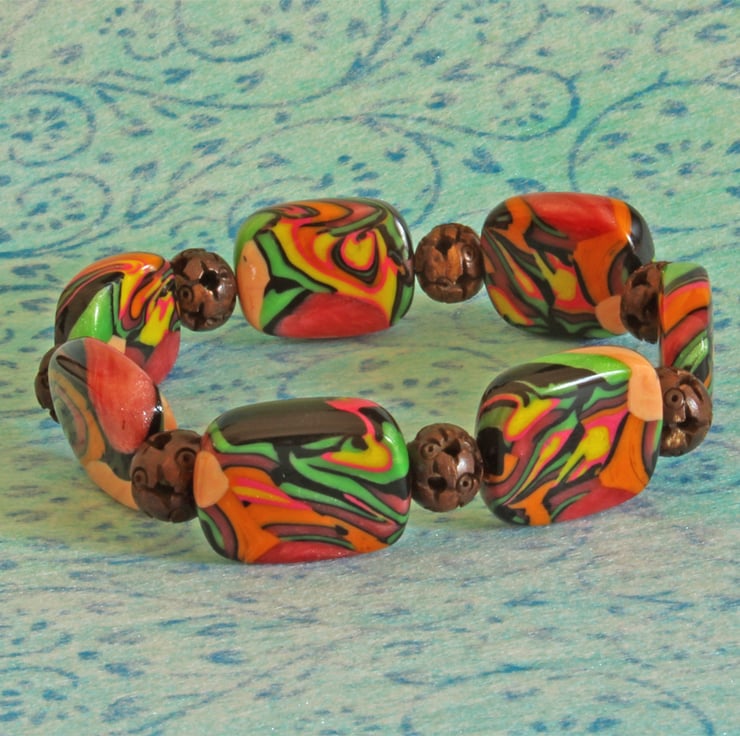 The colourful beads are of polymer clay, finely polished and very reliable, the colours won't fade or wash out at all. The round beads are carved wood, from Tibet. The bracelet is about 8" around (pretty standard bracelet size) and the beads are threaded upon unbreakable stretchy elastic.