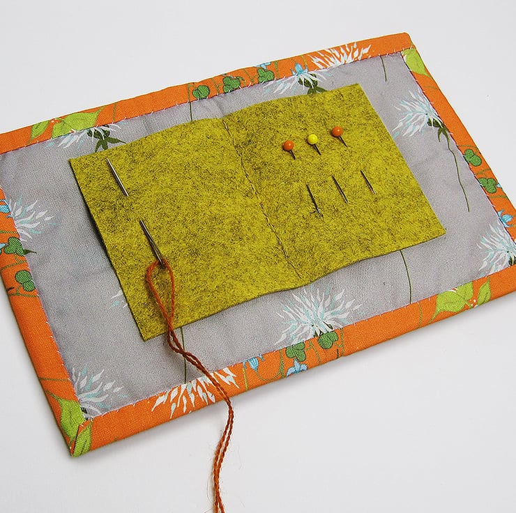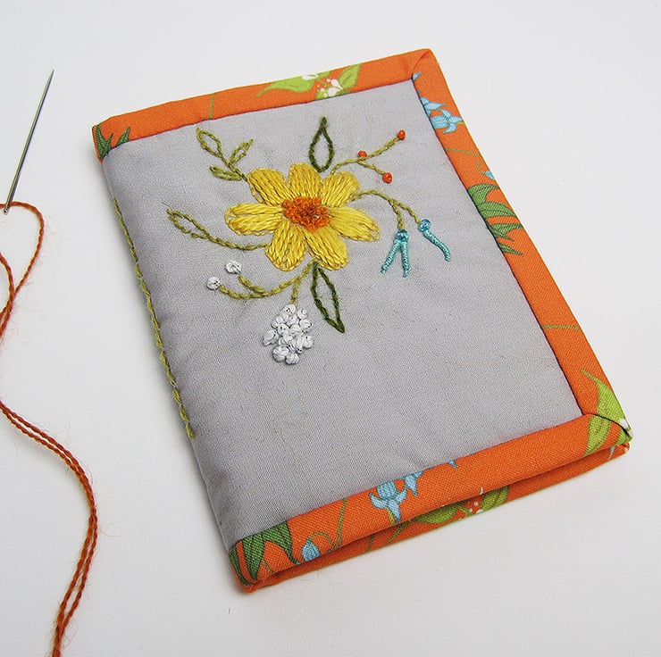 The set includes pale grey cotton poplin needle case with hand embroidered spring flowers on the front. The inside is lined with my own thistle print and the edge is trimmed with my orange dead nettle print. Inside is a mustard felt "page" to pin onto. The case comes with some pins and a needle. Size 8cms by 11cms.