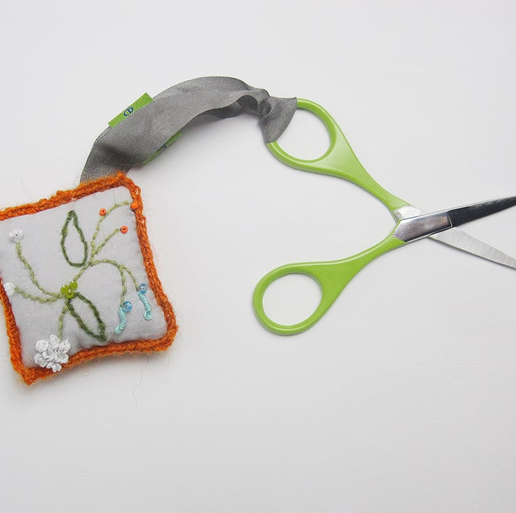 The third piece in the set is a pale grey cotton poplin scissor keeper with hand embroidered spring flowers on the front, the back is my orange dead nettle print and the edge is trimmed with crochet in Alpaca yarn. The green handled sharp pointed scissors are also included.