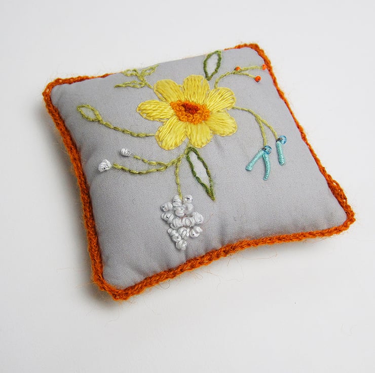 The second piece is a pale grey cotton poplin pincushion with hand embroidered spring flowers on the top, the back is my own thistle print and the edge is trimmed with orange crochet in Alpaca yarn. Size 8.5cms