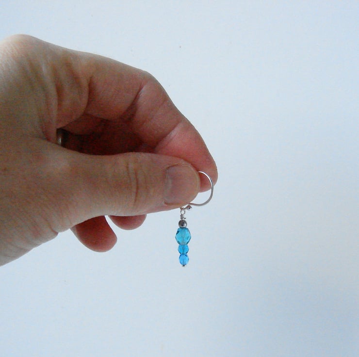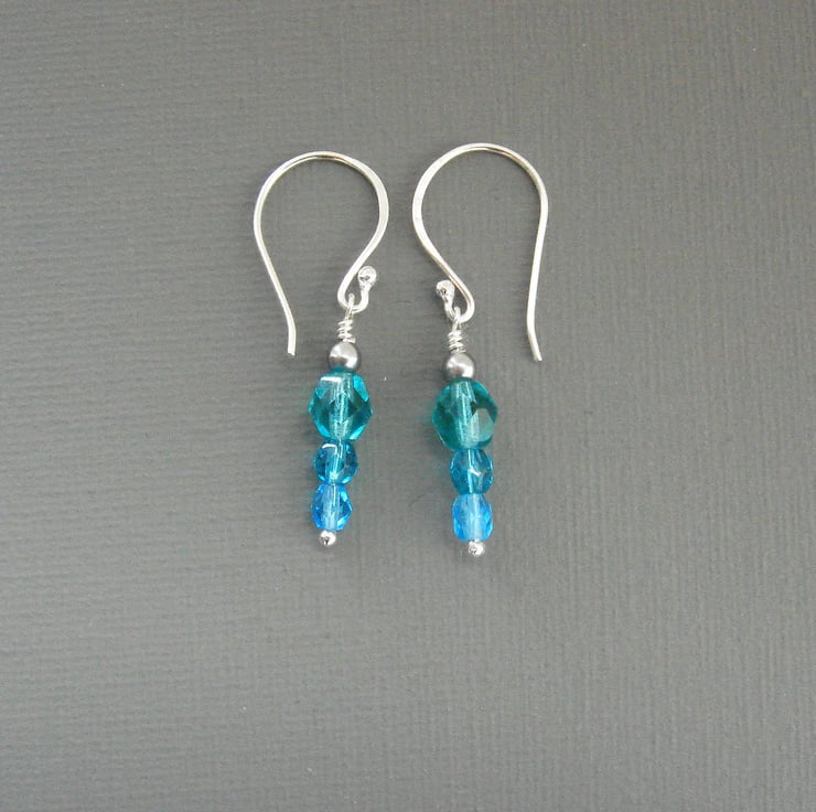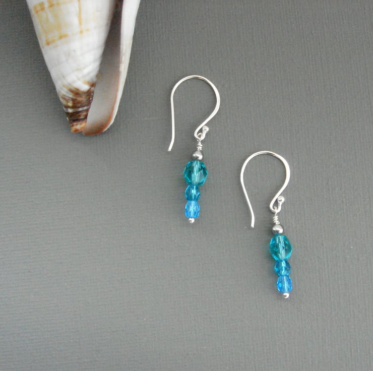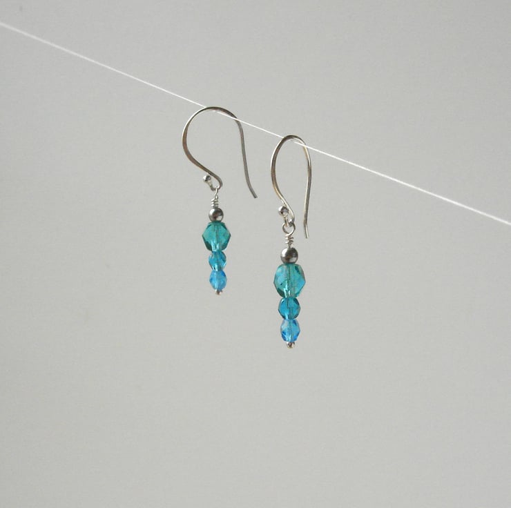 Three beautiful shades of Czech Glass beads are mounted on sterling silver wires, from sea-green, through clear turquoise to sparkling aquamarine. Each earrings measures 40 mm or 1.5" in length and hangs from sterling silver findings hand made by me at my home in West Sussex.