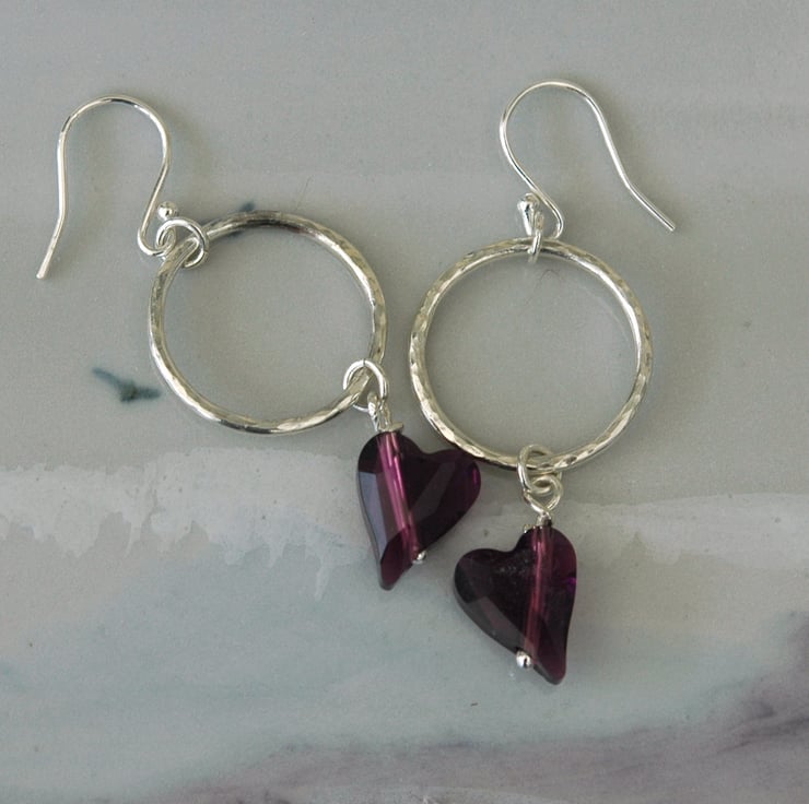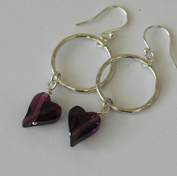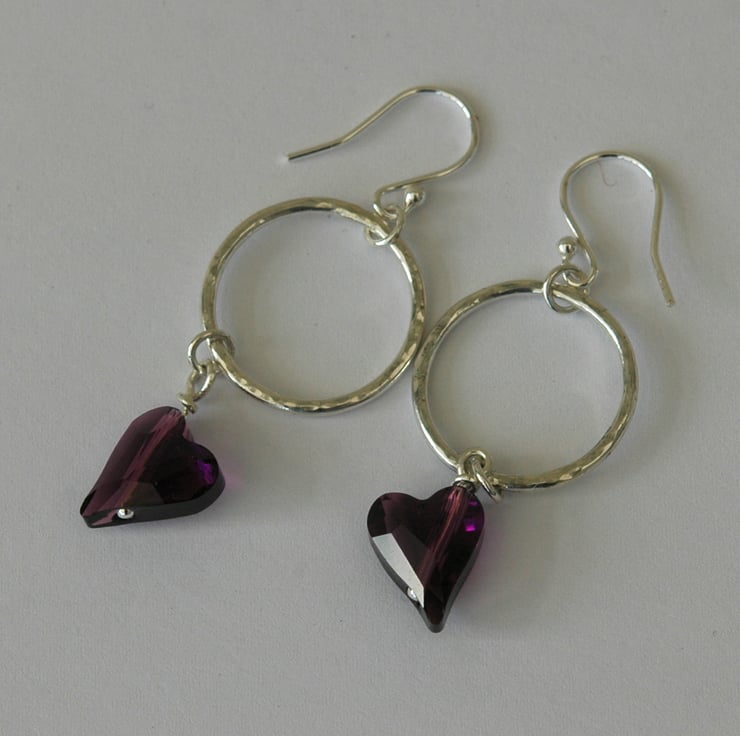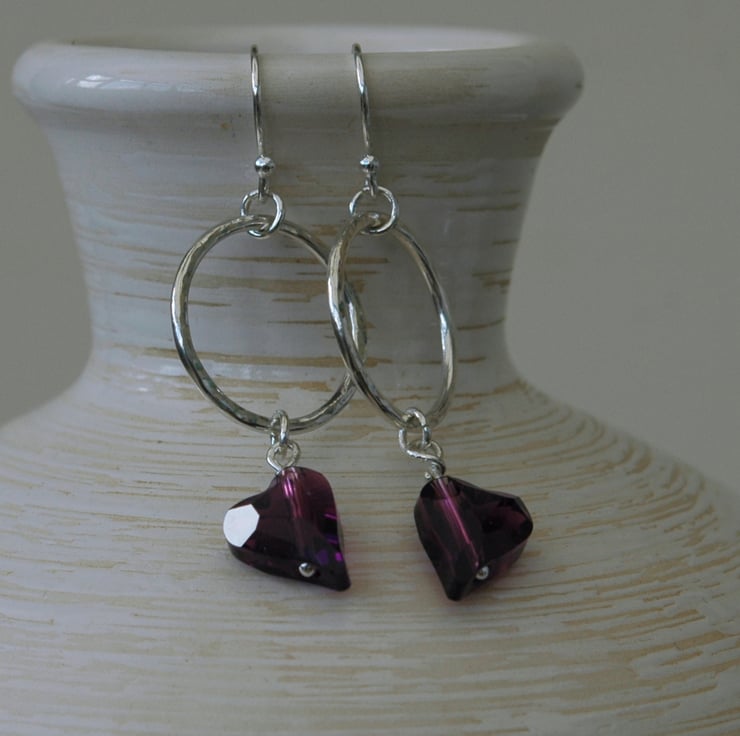 These lovely sterling silver drop earrings are pretty and fun to wear. I made the hoops from 2mm sterling silver wire, hammered so that they sparkle in the light. I have added Swarovski® crystal 'wild heart' charms in a beautiful deep amethyst colour. The ear hooks are stamped '925' to indicate that they are sterling silver. These earrings are light and comfortable to wear and dance around freely as you move. They will be packaged in a smart gift box and sent by Royal Mail first class post.