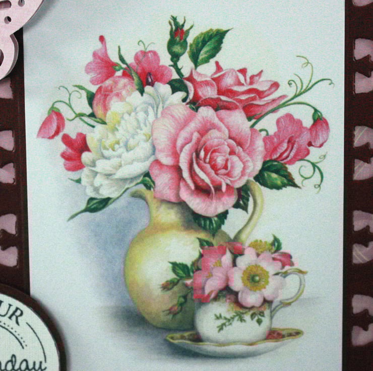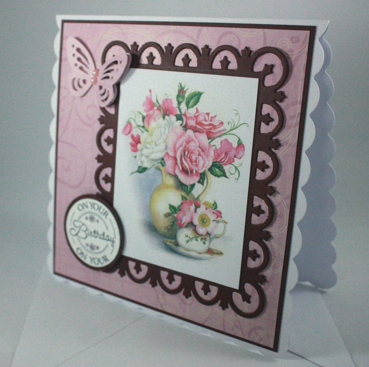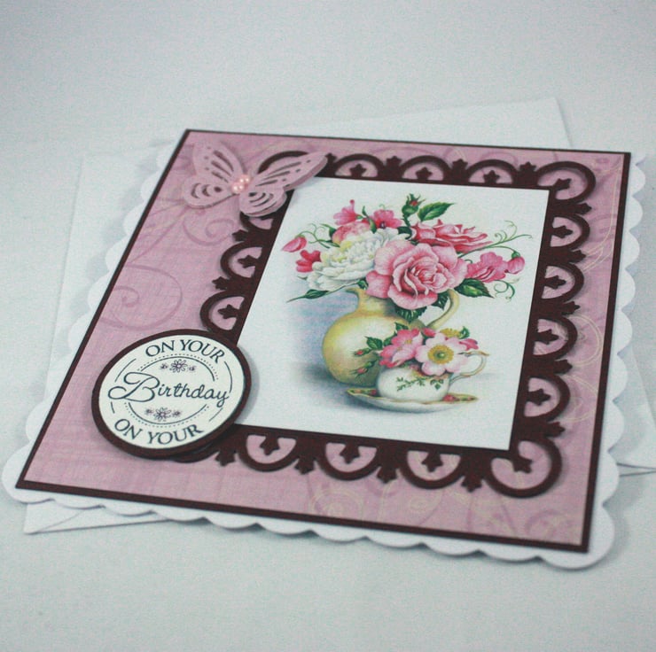 Square handmade birthday card. The card features an image of a vase of roses, mounted onto a die cut burgundy frame and layered onto patterned pink paper. The message 'On Your Birthday' has been stamped and layered onto the same burgundy card. A matching die cut butterfly flies across the front of the card.