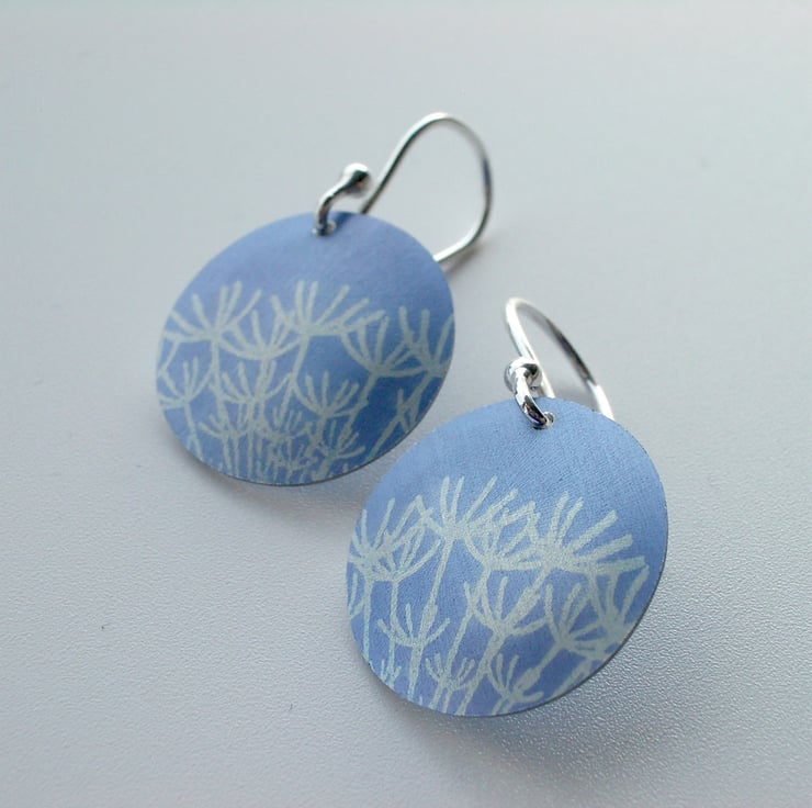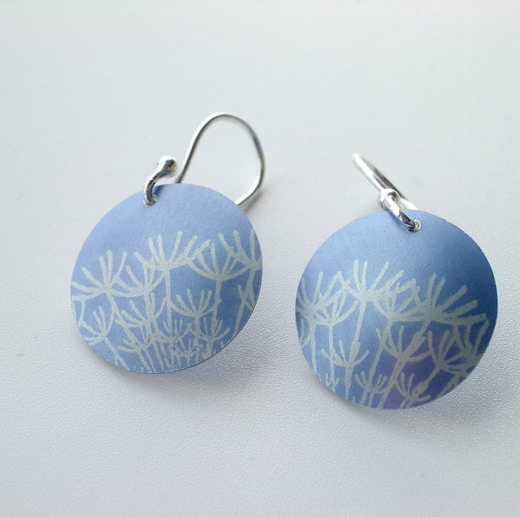 These soft blue earrings are made from aluminium which I have dyed a lovely powder blue and printed with a dandelion clock seed head print. I cut the disc shapes by hand using a piercing saw and file the edges to give a nice smooth finish.