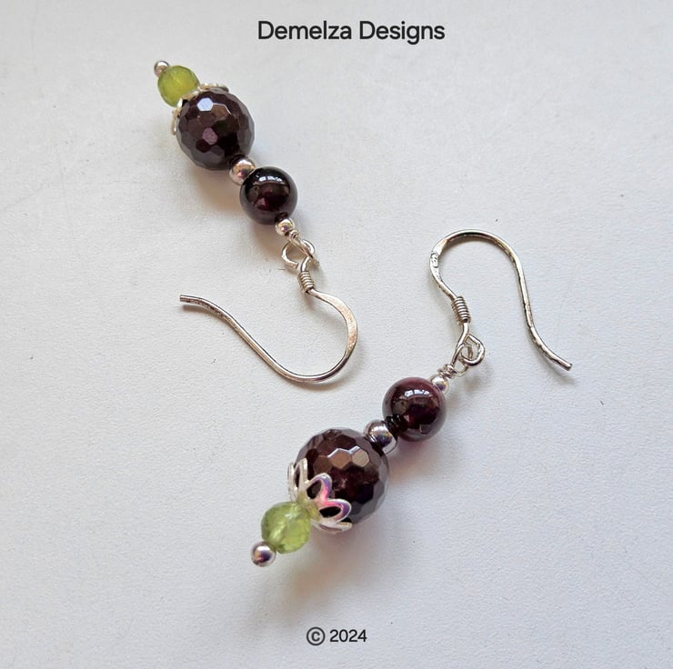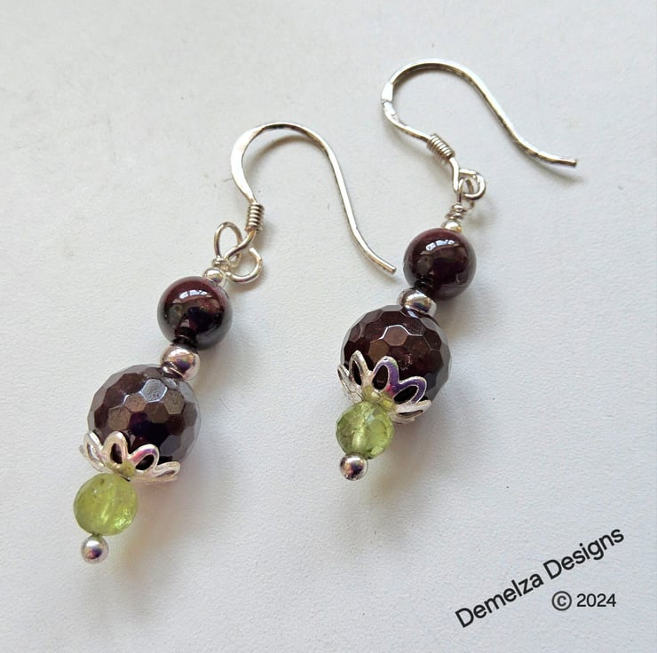 These lovely drop style earings have been designed and hand crafted in Cornwall using quality deep rich faceted 10mm indian red garnet rounds and smooth 6mm indian red garnet gemstone rounds with quality faceted peridots. They have been constructed using all 925 sterling silver components and will make a lovely genuine gemstone gift for any lady who only wears quality jewellery.