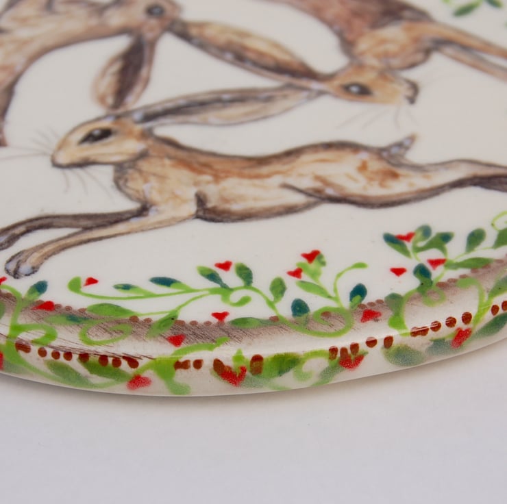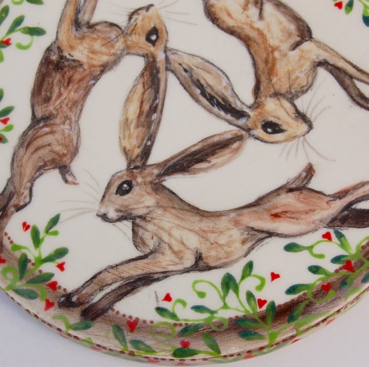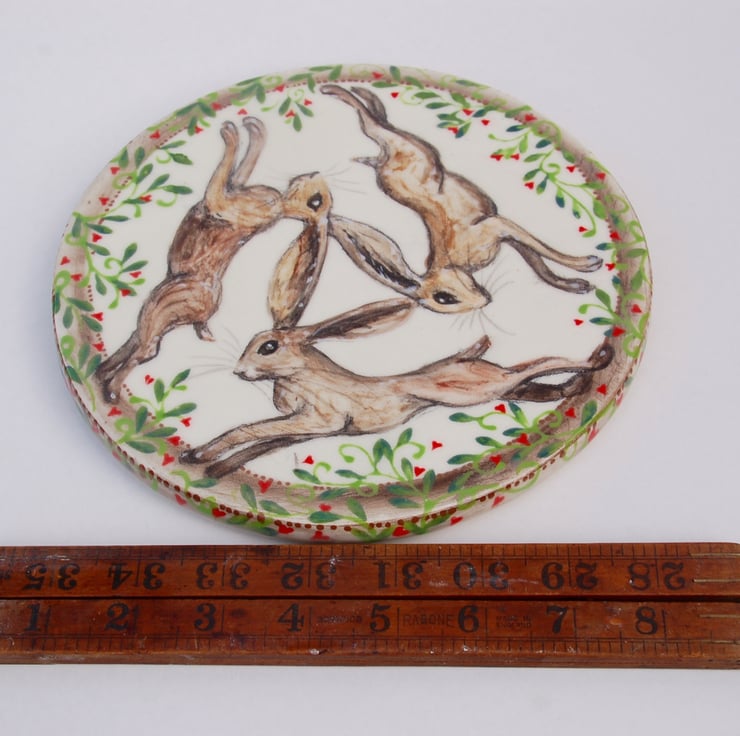 This is a handprinted ceramic trivet, painted in food safe underglaze colour and glazed in leader glaze. It measures 20 cm across and is a cm thick with stubby feet on the bottom. The three hares are 'Tinners' hares with interlocking ears. I have painted a sepia band round the edge and decorated with foliage and red hearts. I have one of these trivets in my kitchen, but often it gets used as a cheese board as it is the perfect size for a block of stilton..or cheddar (or indeed any other cheese!)