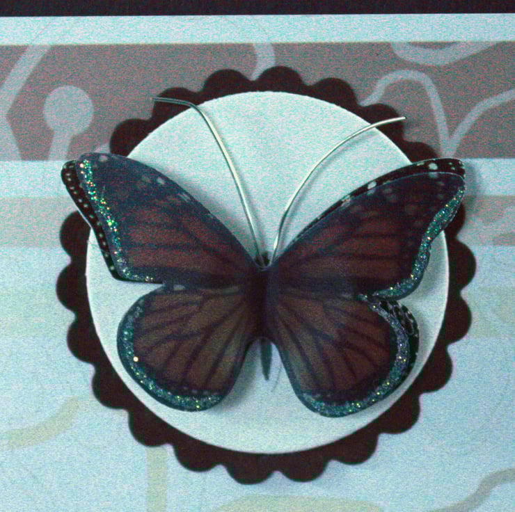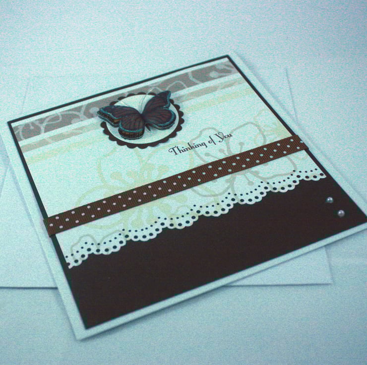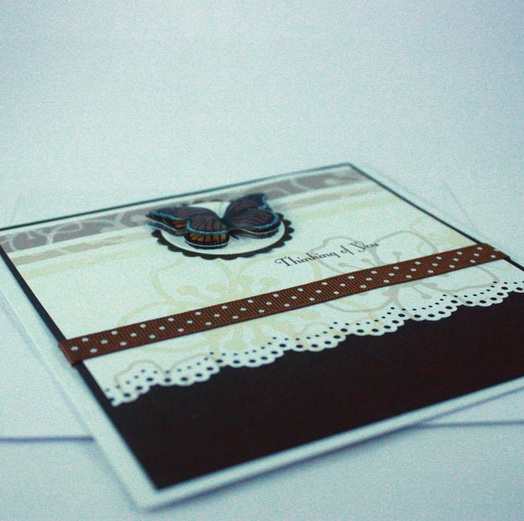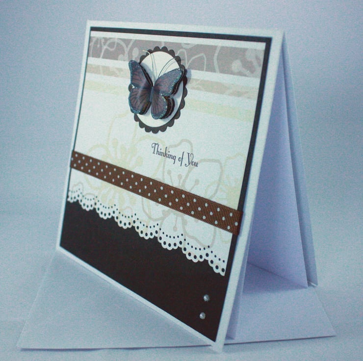 Square, handmade card featuring a 3 dimensional vellum butterfly on a pretty cream and brown background with ribbon and faux pearl embellishments.