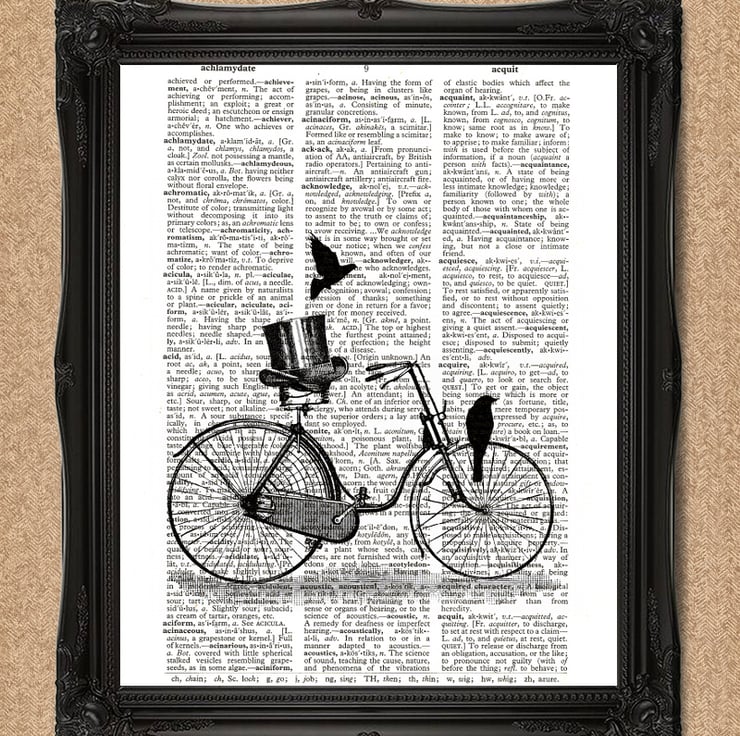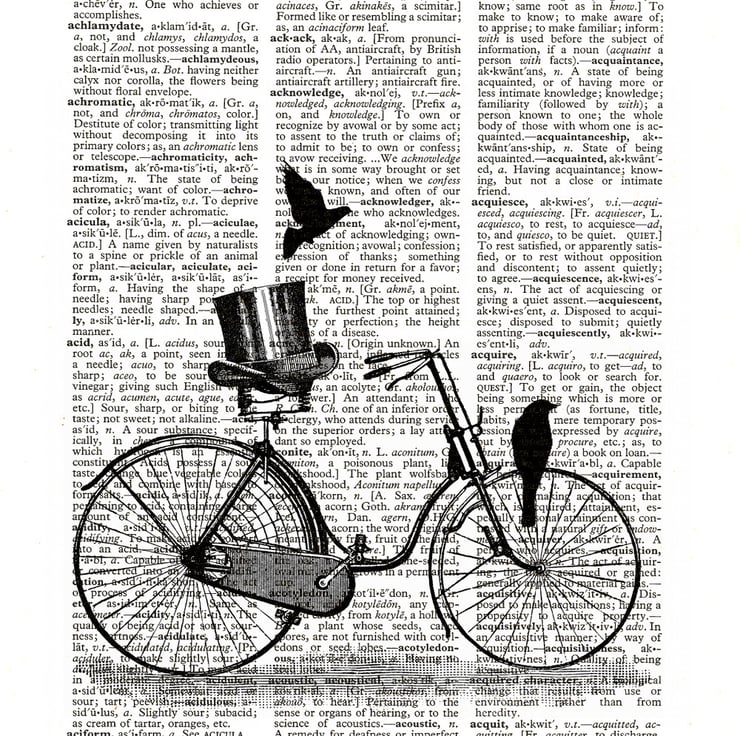 Vintage bicycle dictionary art, with a top hat on the seat and 2 black birds. Printed onto an upcycled vintage dictionary page.
