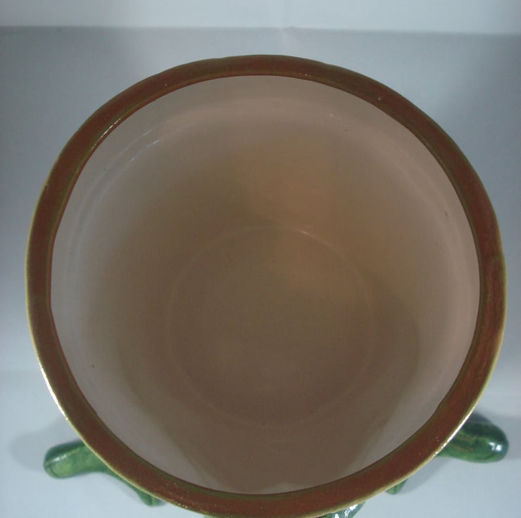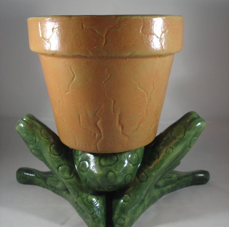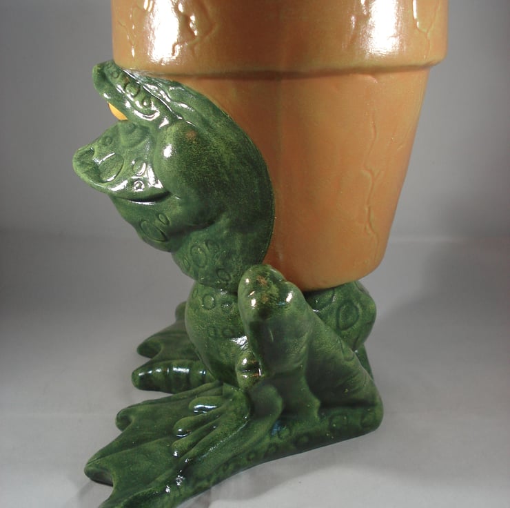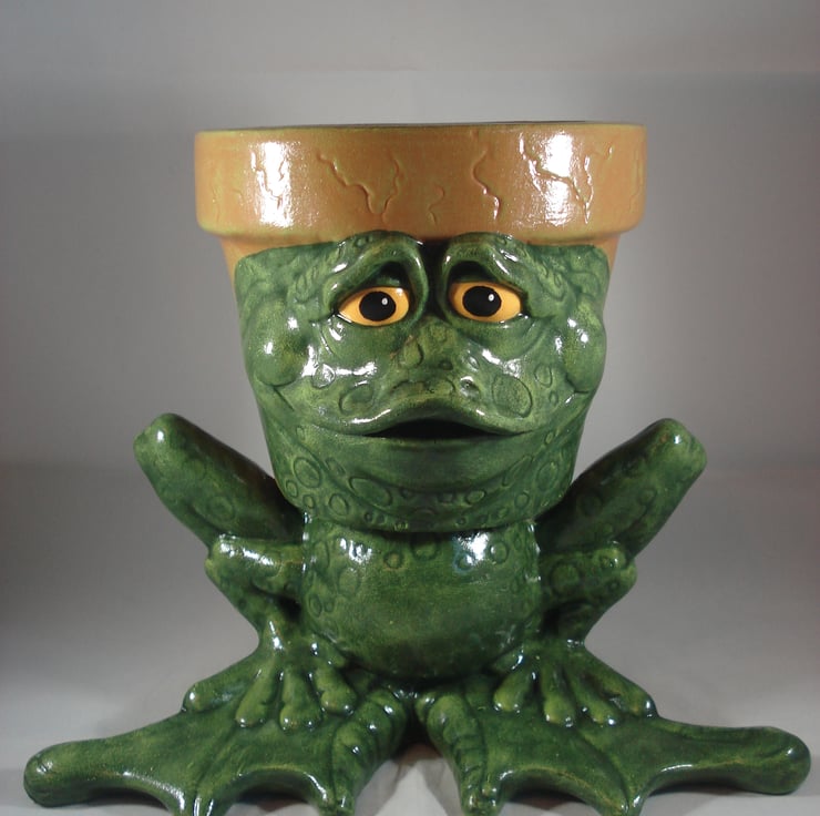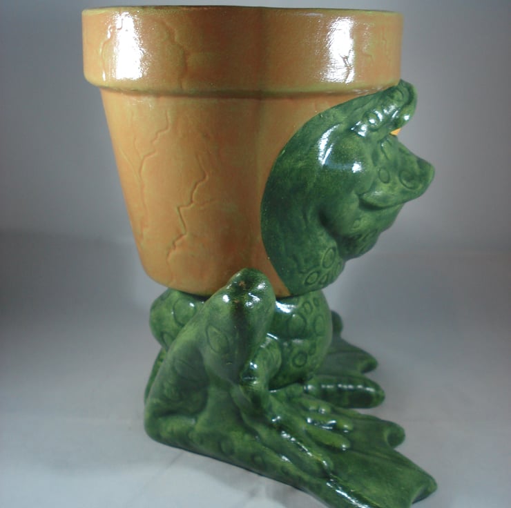 I have for sale a novelty plant pot, which was hand painted by myself. It is from a range called 'Waddle Pots, this one is a green frog or toad. The pot has no holes in the bottom, so it can be used indoors or outside. The back part of the frogs head is the plant pot, which is in a terracotta colour. This would make a fun and novel addition to anyone's home or garden, or perhaps given as a gift.