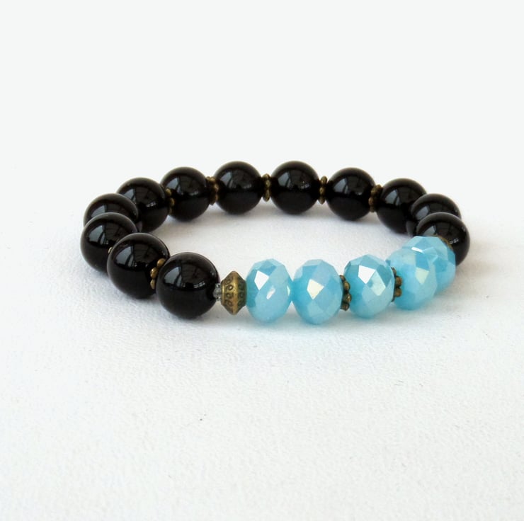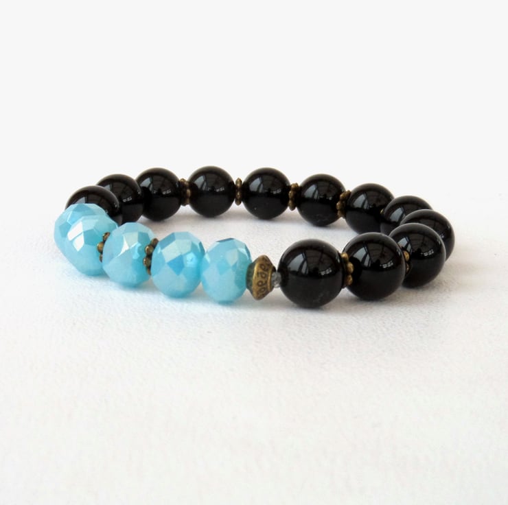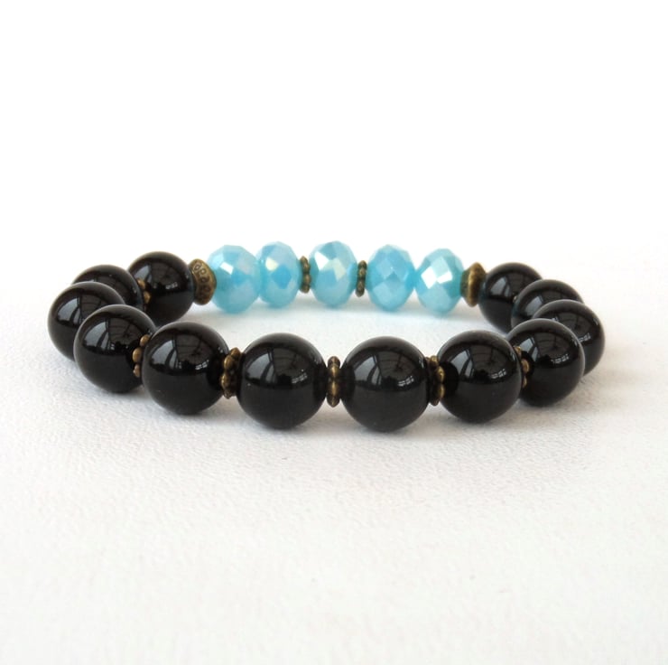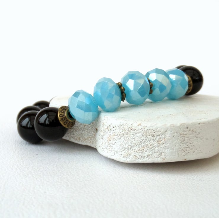 A great contrast between polished black onyx and lovely sky blue crystals in this stunning stretchy bracelet.