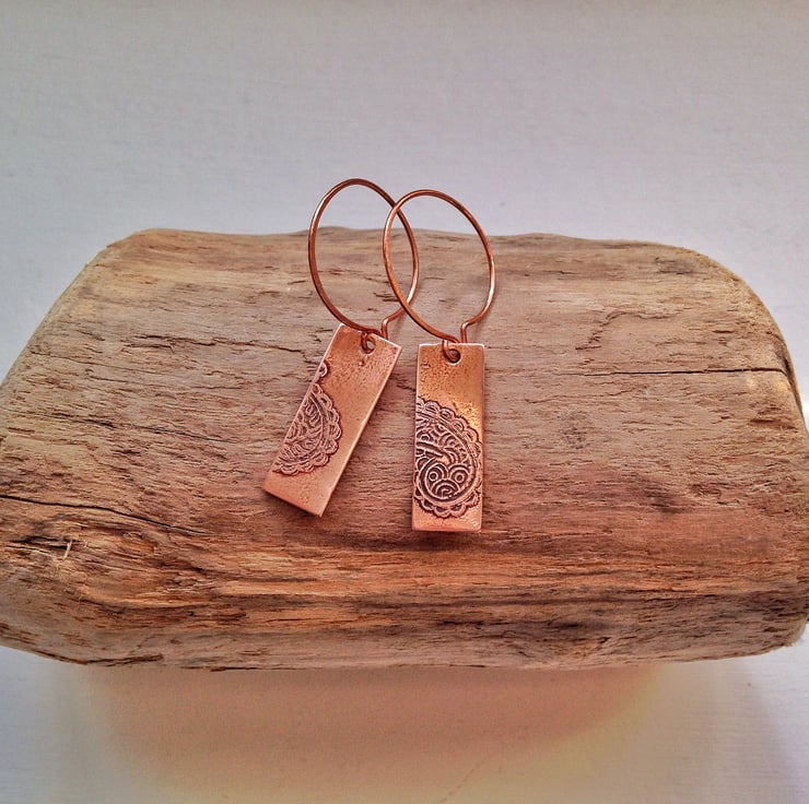 Hand cut and etched Paisley pattern earrings on hand made hoops,