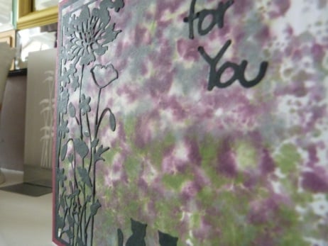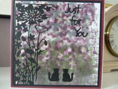 A completely handmade and unique designed card. Consisting of a background of a garden, hand created using alcohol inks. A border of flowers die cut from black card and two cats die cut from black card, decorate the card. Finished off with a Just for You die cut from black card. Mounted onto black card, then dark red card and then onto pristine white quality card.