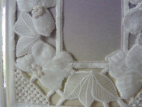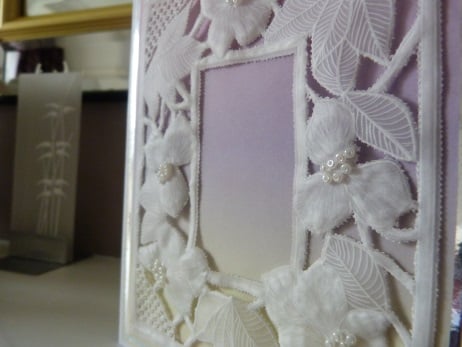 A completely handmade and uniquely designed card. Consisting of a pretty flower and leaf design embossed, pierced and cut from parchment. The centre rectangle cut out which would accommodate a picture of your choice or wording of your choice. Decorated with pearl beads. Mounted onto rainbow vellum, then onto silver mirri, then gold pearl card then onto pristine white quality card.