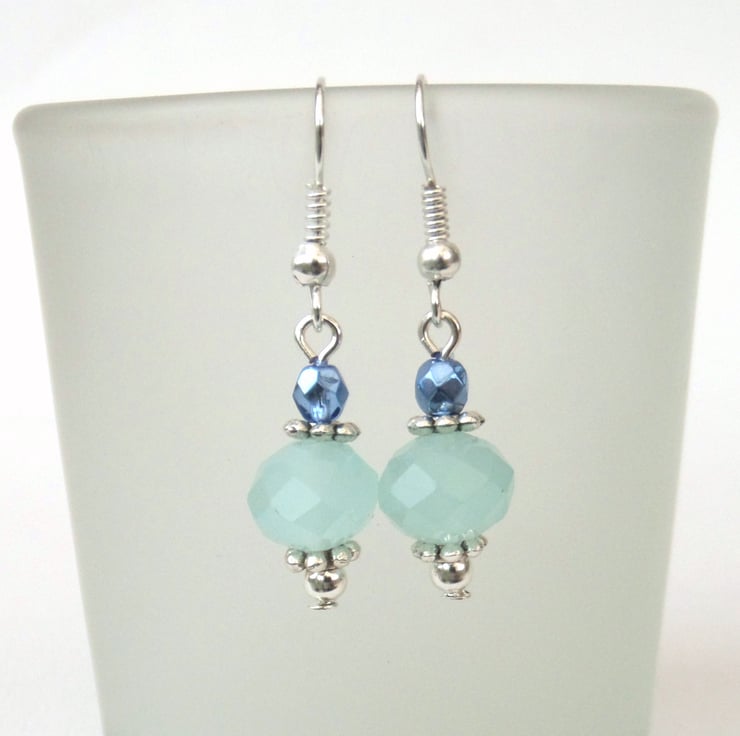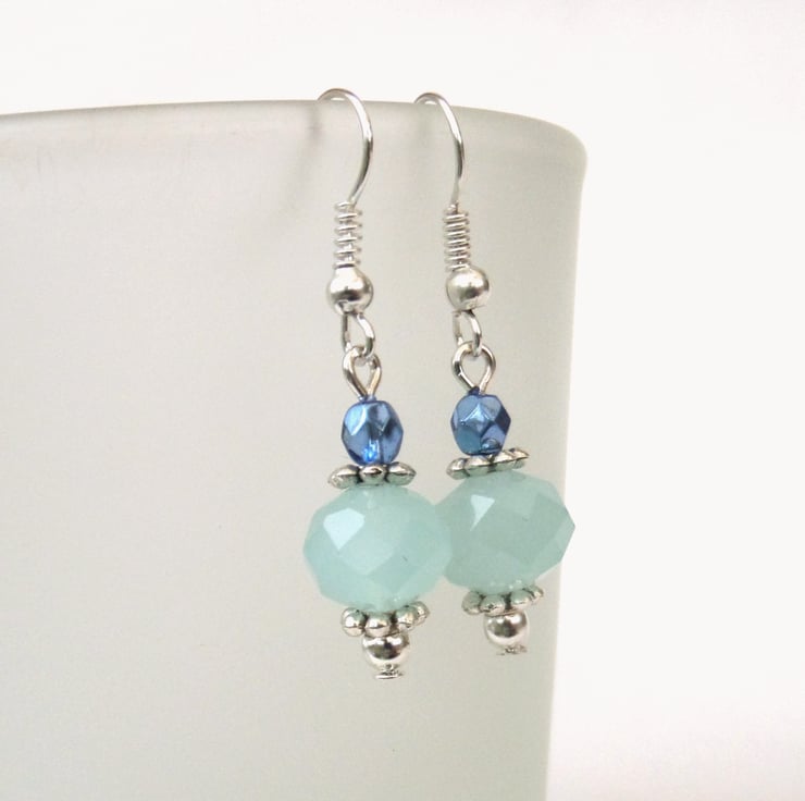 A pair of handmade earrings, combining lovely soft / aqua blue crystals with a sea blue half polished crystal.