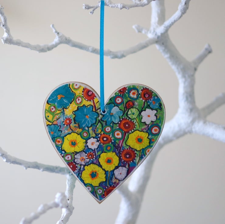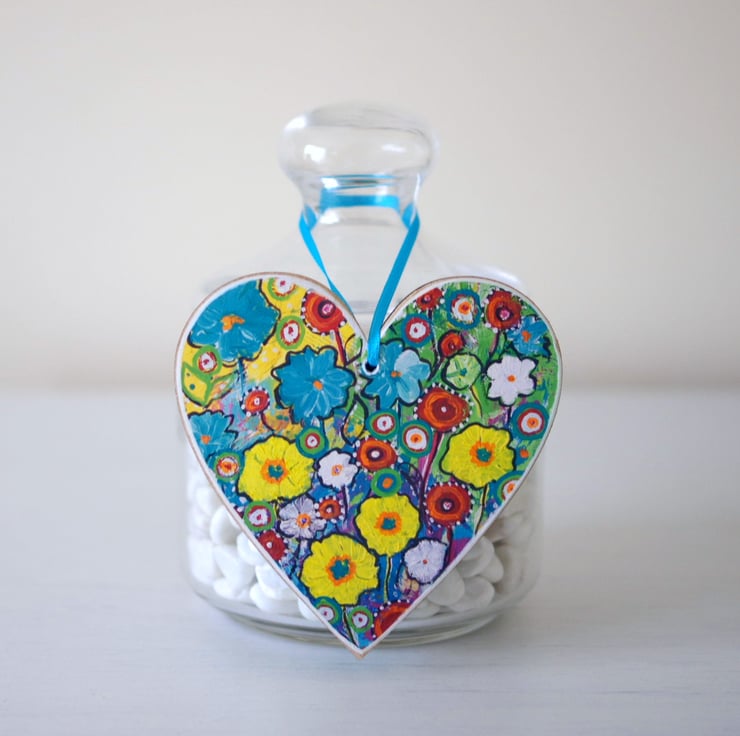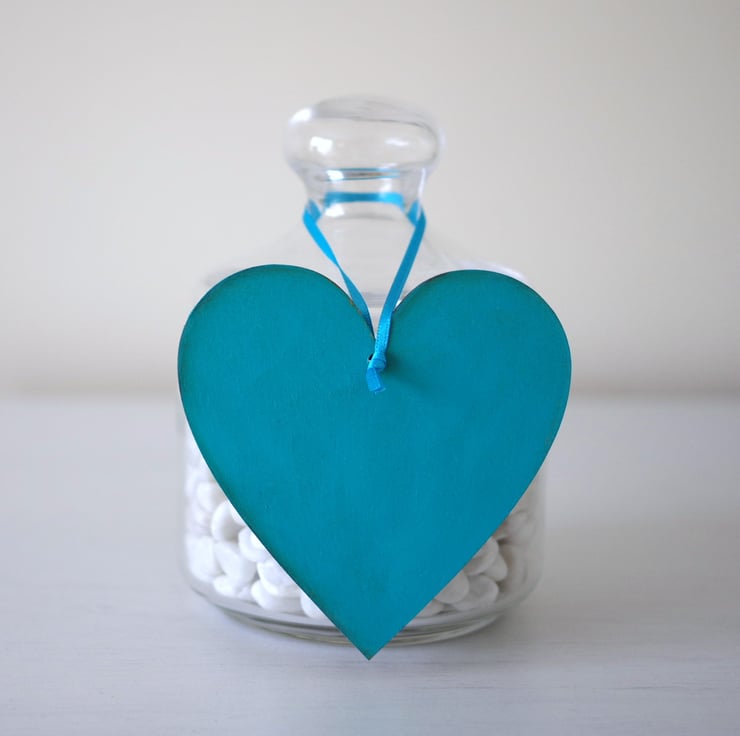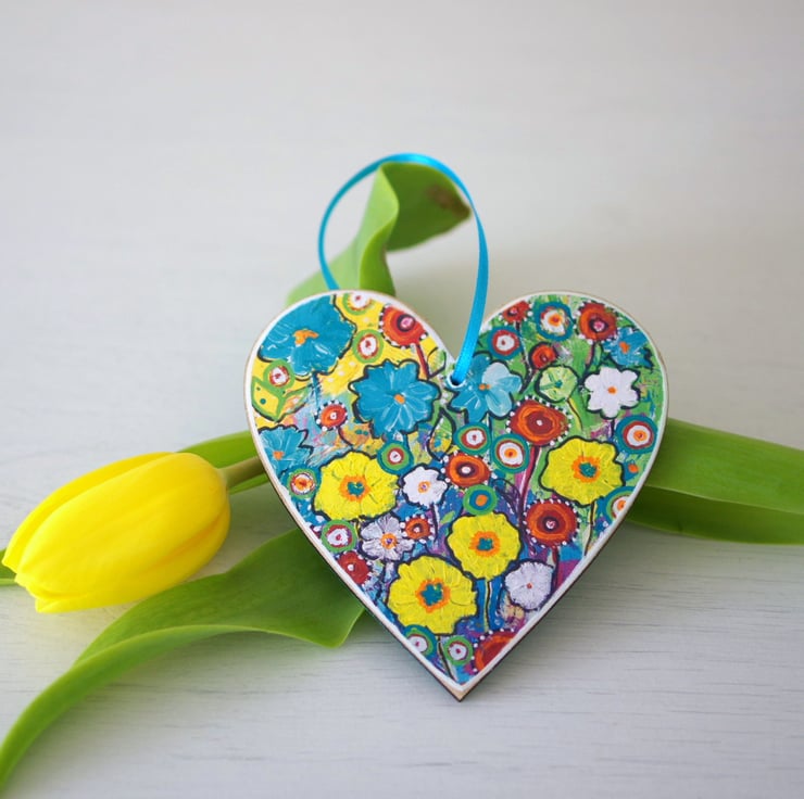 I made this turquoise floral hanging decoration using an art print after one of my mixed media paintings 'Summer Joy', mounted on a wooden heart. It measures approx 4" x 4" and it is perfect as a gift for Mother's Day, Valentine's, Easter, housewarming or any other occasions. The reverse side is painted in turquoise acrylic paint and then varnished for protection. The heart in the photo is the one you'll receive as each piece is unique.