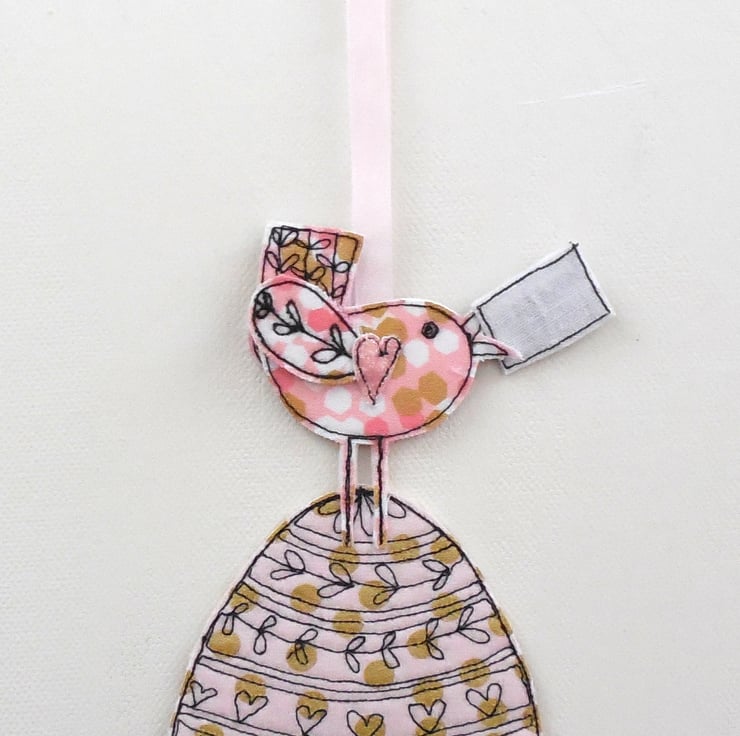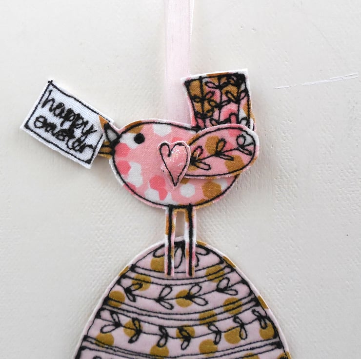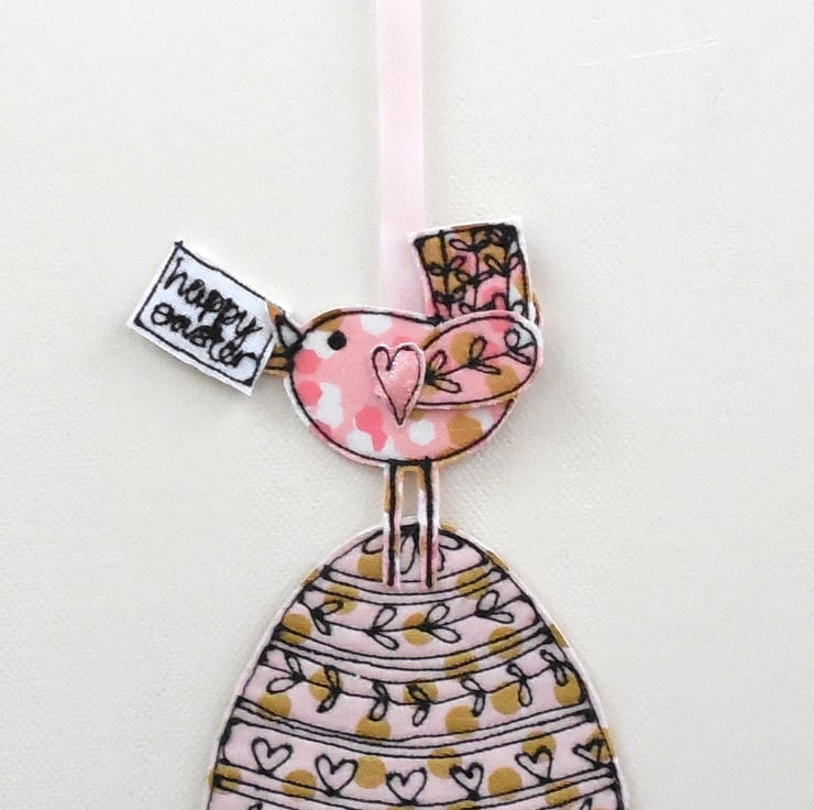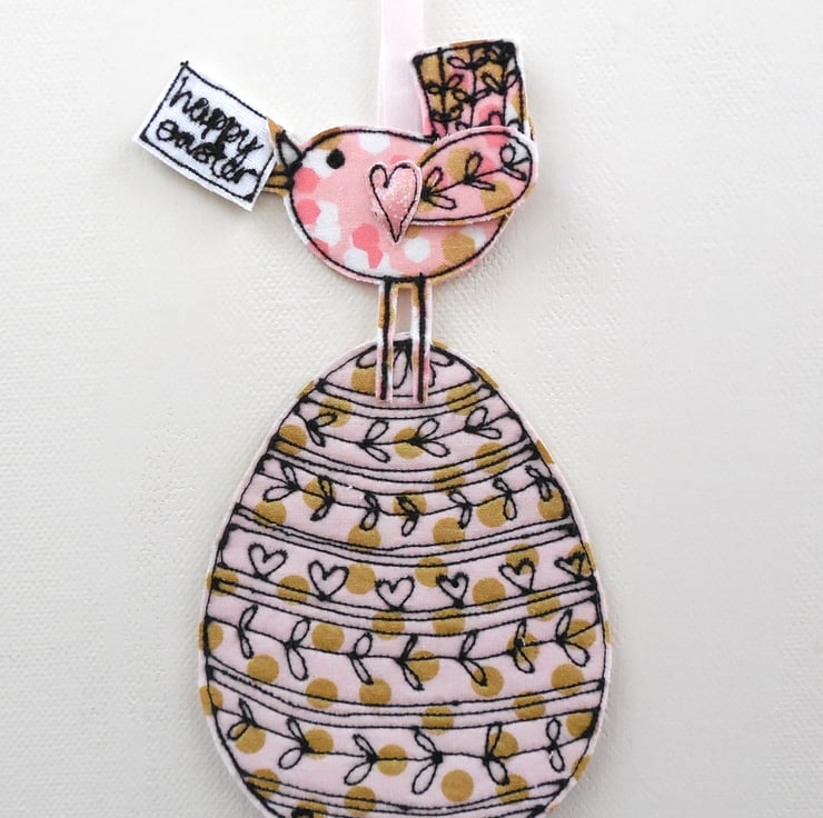 A fabric Easter egg decorated with a sewn pattern and gold spots, with a birdie sitting on top holding a sewn fabric label 'Happy Easter'. Measuring approximately 15cm by 7cm with a ribbon to hang, your Easter egg will be sent in a glassine envelope with a heart label to close.