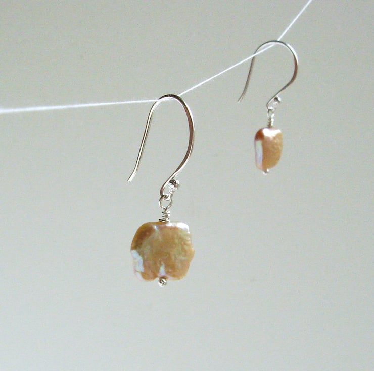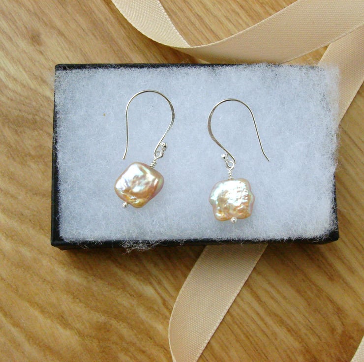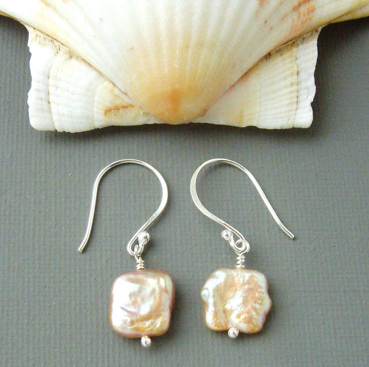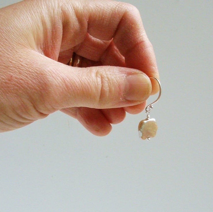 These unusual square freshwater pearls have a simply incredible lustre and rainbow iridescence. They are formed by culturing freshwater mussels. The colour and shape are determined by the available space the mussel has in it's shell and by it's genetics so they are a wonder of nature. These eye-catching beads have been mounted on my own sterling silver head pins and wire which I make at my home in Sussex. The earrings themselves measure a very dainty 35 mm 1 1/4" and come boxed ready to present to your loved one.