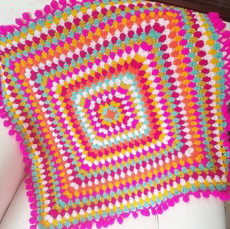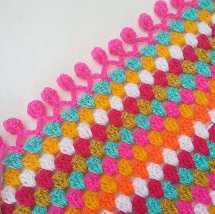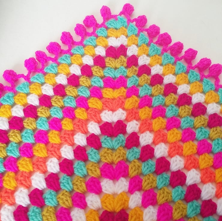 The perfect baby girl blanket, and a beautiful nursery decoration- a lively and vibrant spring and summer inspired 25 x 25 inch handmade blanket, with a fabulous pom pom border!