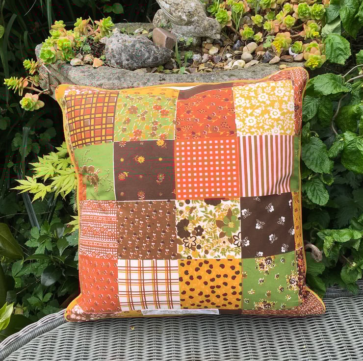 Snail scatter cushion in a linen mix fabric. A Large brightly coloured snail adorns the front of the cushion. On the back of the cushion is a co-ordinating retro patchwork style cotton fabric, makers label and hidden zip. Edged in Mustard yellow piping.
