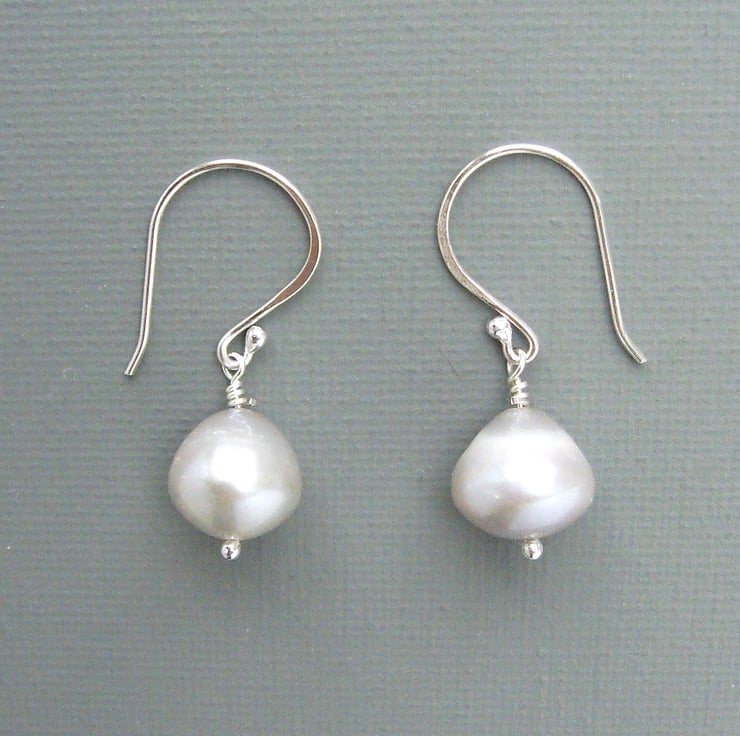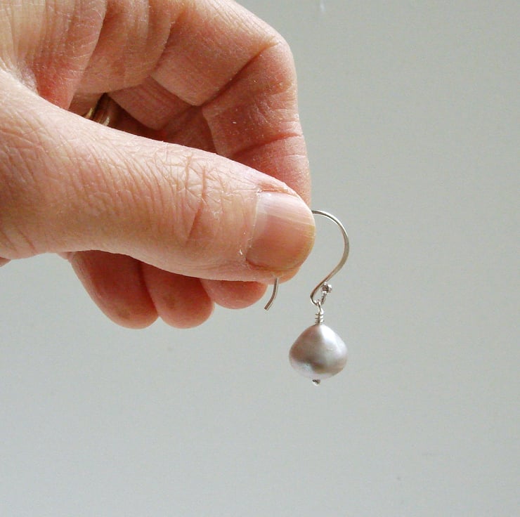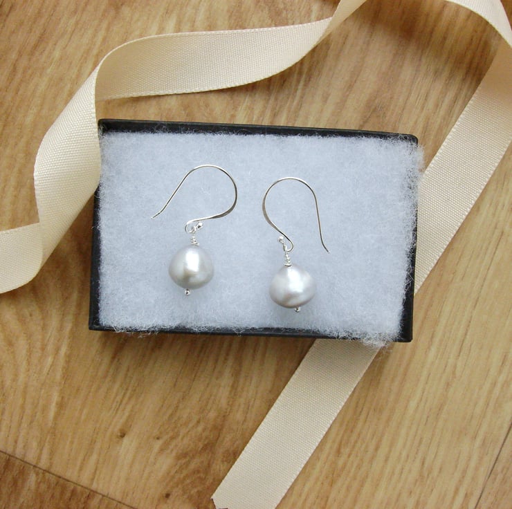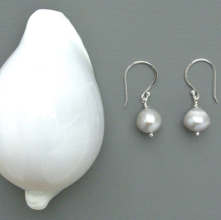 Soft silver grey freshwater pearls are mounted on my own classic hand made silver findings. These pearls are quite large and chunky at 10 mm in length and are an unusual conical shape which I find fascinating. The earrings themselves measure a total of 35 mm or 1 1/4" in length. These pearls are really special, not just because of their size but because they have an extremely smooth surface and wonderful lustre that captures the light and returns it many colours, just like the earring in the painting that inspired them. They are carefully packaged in a box ready to be presented as a gift.