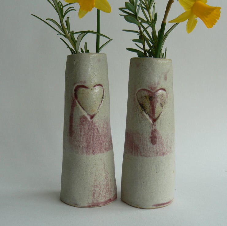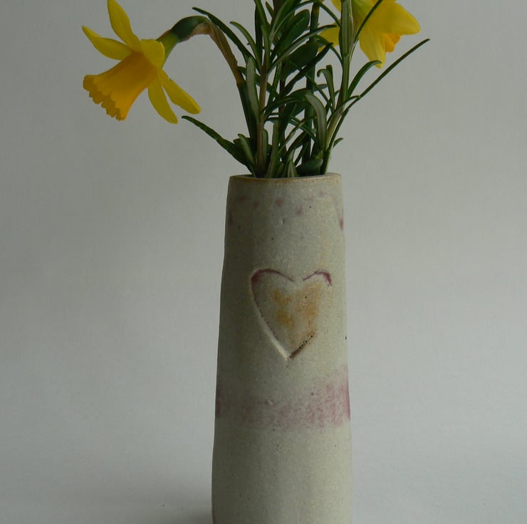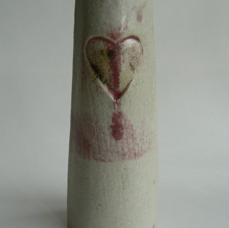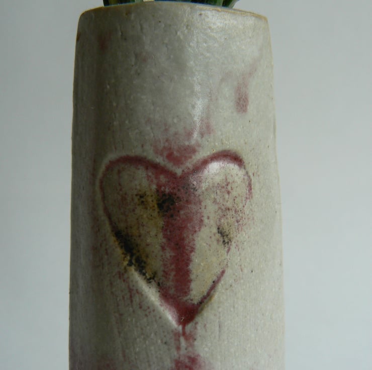 Ceramic stoneware vase with a heart stamped on both sides slab built from a white grogged clay fired to 1280 C in a reduction fired atmosphere. The glaze is slightly shiny and the copper present in the glaze has turned red in the reduction firing.