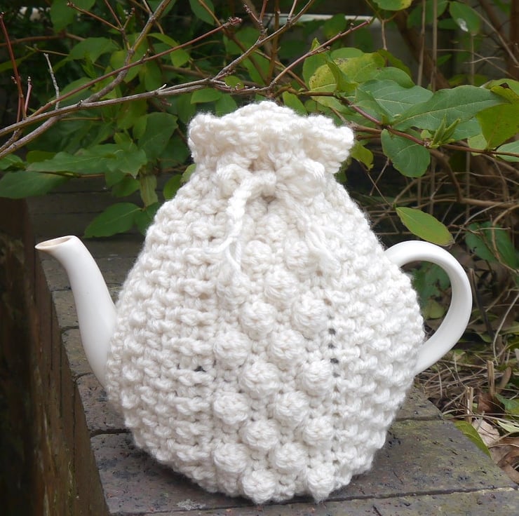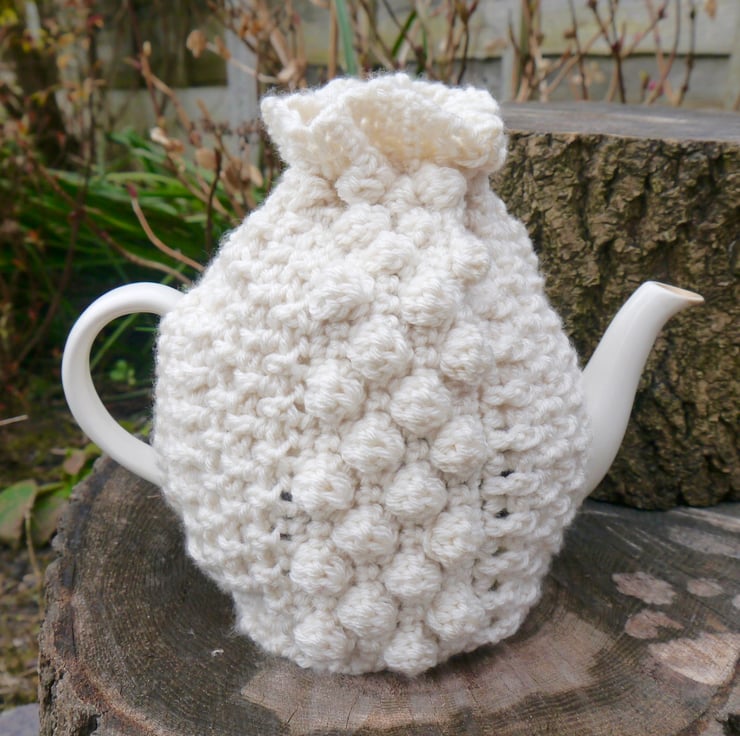A beautifully soft cream textured tea cosy made with thick, warm aran yarn. I have crocheted and designed this myself using basket stitches and bobble stitches. It has a drawstring crocheted cord tied around the top to finish it off.