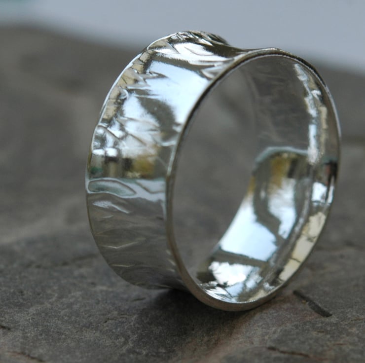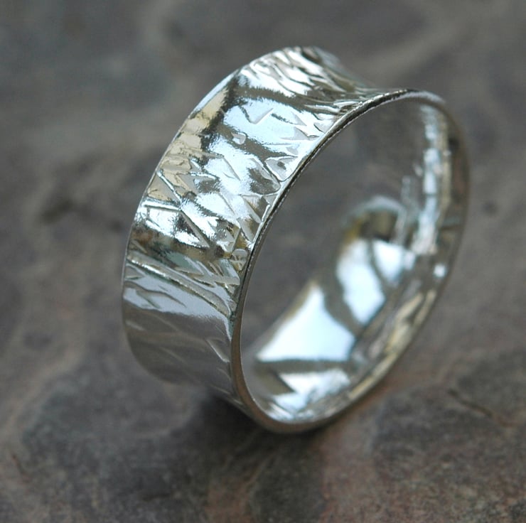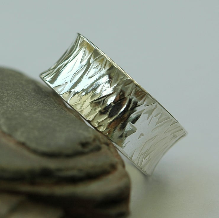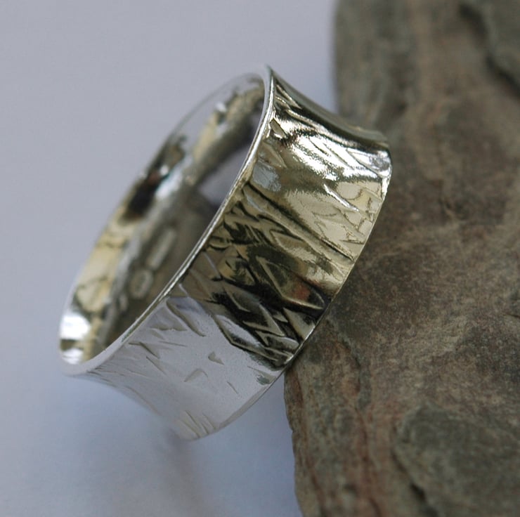 This chunky ring makes an ideal gift for the man in your life. It has been cut from 1mm thick sterling silver sheet textured with a patterned hammer that creates a random assortment of Xs and wedge-shaped imprints. The silver is 10mm wide and I have formed it into a flared, anticlastic shape that looks trendy and is easy to put on or take off. It is available in size W - but with wide rings it's a good idea to buy a larger size, so if you normally wear size V this is ideal. It weighs a substantial 7.2g and has been hallmarked at the London Assay Office. I have polished it to a bright shine. Let me know if you would prefer a darker, oxidised finish that accentuates the imprint.