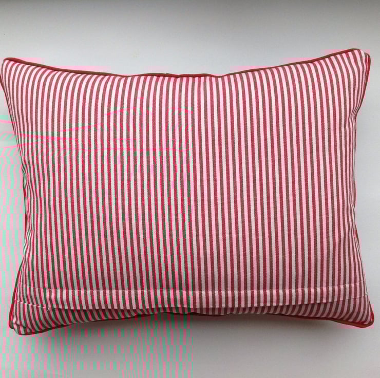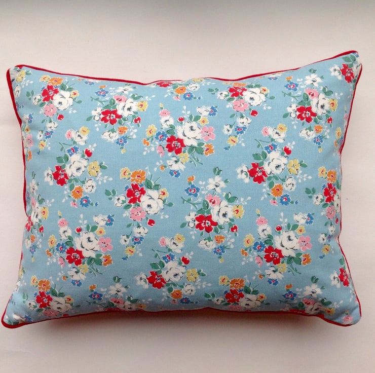 A pretty cushion made from Cath Kidston floral fabric with contrasting red piping a red and white striped ticking back. Filled with a duck feather pad. Rectangular shape measuring approx 16 inches x12 inches 41 x 31 cm. Constructed with a concealed YKK zip and overlocked seams for a professional finish and easy laundering. 100% Cotton Hand wash only.