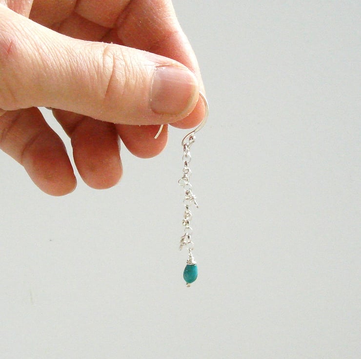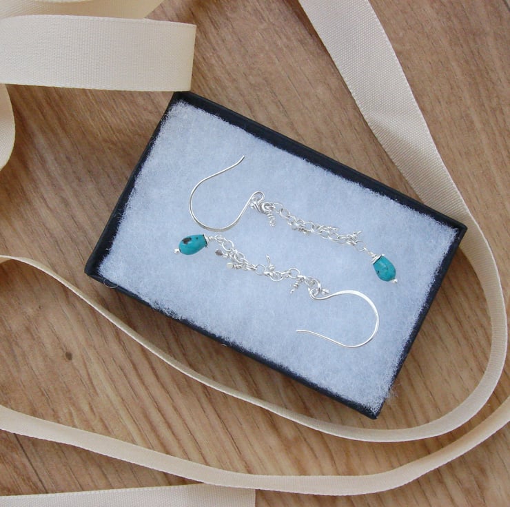 I created these elegant bohemeian style drop earrings by forging tiny flat "mirrors" from sterling silver wire, attaching them to the fine sterling silver chain using wrapped loops which I created using jewellers' pliers. This creates a brilliant sparkle when the earrings move. The earrings are mounted on my own hand-made sterling silver ear wires and feature A grade genuine semi-precious turquoise (the December birthstone) drop shaped beads with just a hint of black matrix for interest. These earrings measure a dramatic 58 mm or 2 1/4" long and are packaged in their own gift box ready for you to present as a gift.