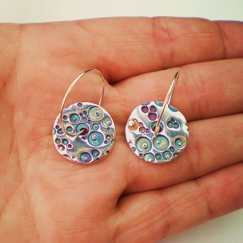 The silver disc measures 1.7cm in diameter, They are hung on 1.8cm diameter sterling silver hoops. The total earring drop is 2.6cm.