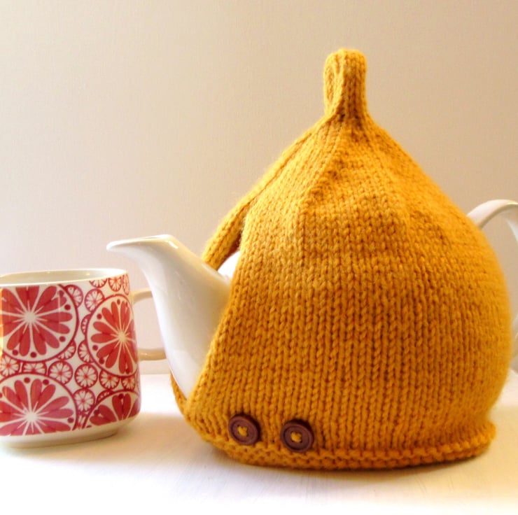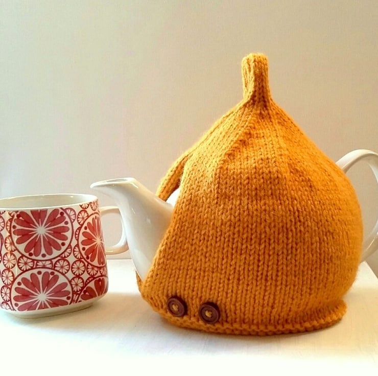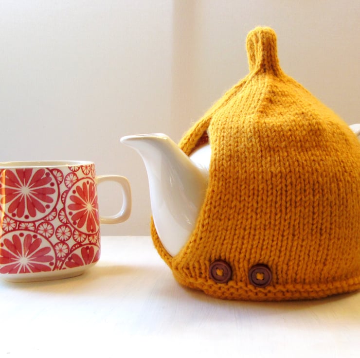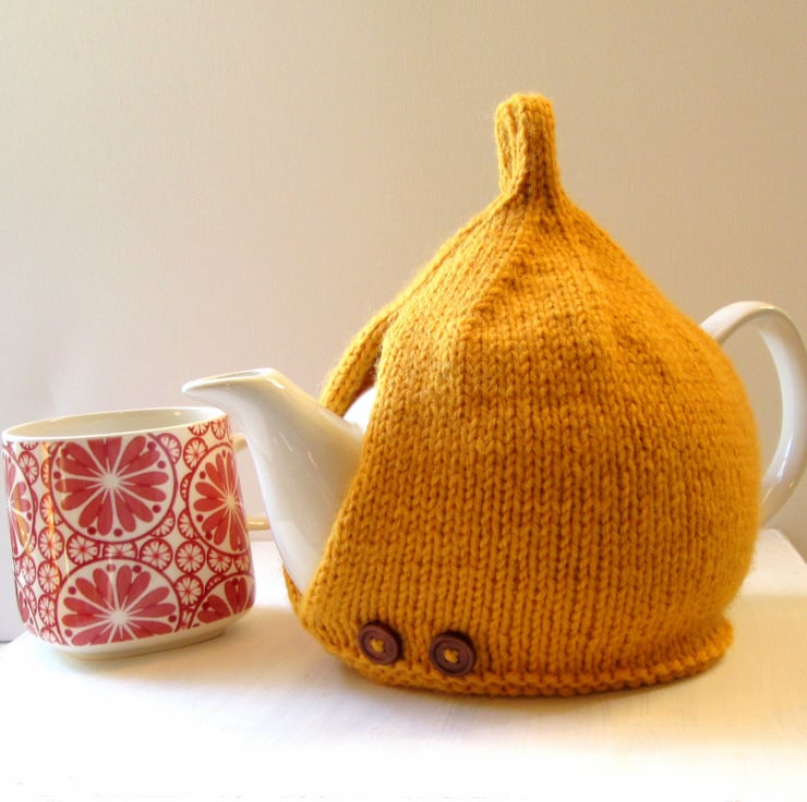 This mustard tea cosy is hand knitted in a lovely and warm Aran wool, which comprises of 25% pure wool and 75% acrylic. It has 4 wooden buttons, 2 sewn on either side of the tea cosy, for decoration and a looped stalk at the top.